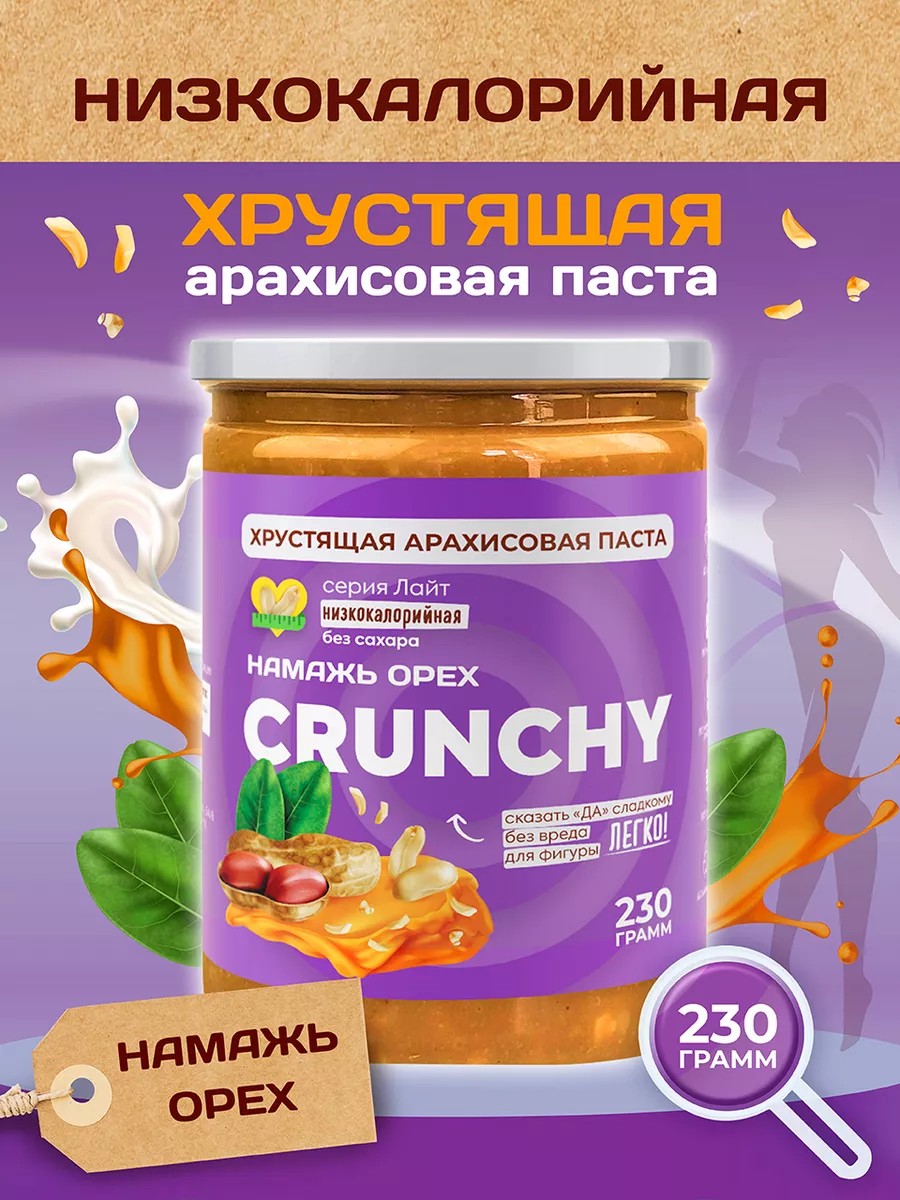 Сказать "Да" сладкому легко! Арахисовая паста CRUNCHY Серия Лайт создана для твоего здорового и полезного перекуса без сахара. Просто попробуй арахисовые пасты от Намажь орех серии Лайт! Все продукты серии содержат натуральный сахарозаменитель эритритол (гликемический индекс - 0). Они обогатят вас энергией и чувством сытости на долгое время без вреда для здоровья и фигуры.