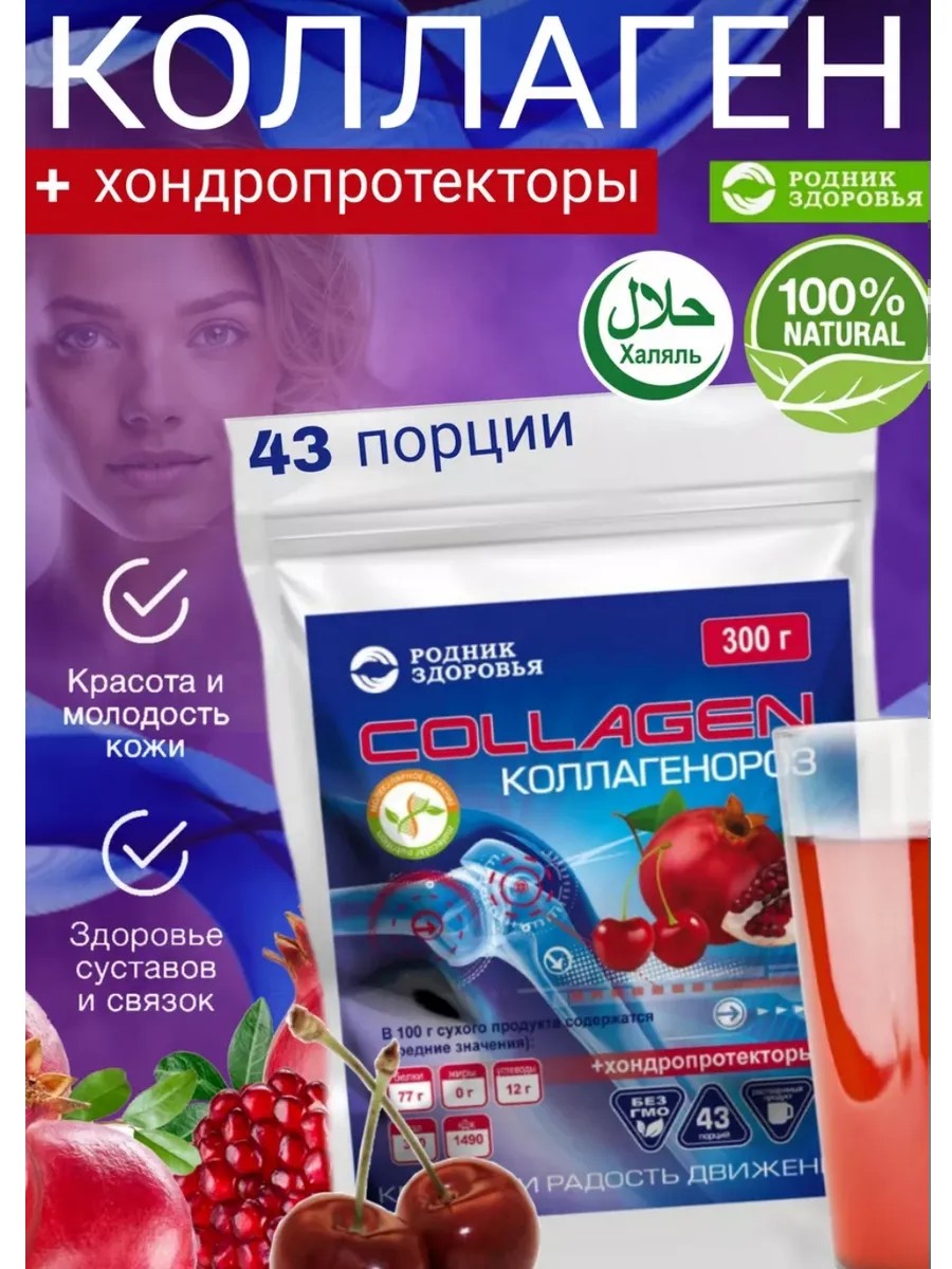 Natural collagen powder from Rodnik Zdorovya is the building block of all connective tissues in our body. Healthy ligaments, joints, bones, and elastic skin all depend on the quality and quantity of collagen in the body. With age, collagen synthesis declines, requiring an additional source of this essential protein. Adequate amounts of hydrolyzed collagen in the body also ensure strong teeth and nails, increase hair thickness, and improve skin condition. It is recommended to take it in combination with vitamin C. Collagen powder is a natural food product, so it is not completely water-soluble, but this does not affect its beneficial properties. Collagen functions: Strengthening bone, cartilage, and ligament tissue; Relieving joint pain and inflammation; Regulating muscle nutrition and accelerating muscle growth; Maintaining healthy and beautiful skin, hair, nails, and teeth; Strengthening vein and capillary walls. Another useful life hack: you can also use our product for a collagen hair wrap. Full instructions included. One package contains 300 g. The contents of one package are sufficient for 40 days. Collagen Beauty (collagen drink). Action: restores connective tissue structure; strengthens skin, cartilage, muscles, hair, etc.; activates the production of synovial fluid; prevents the destruction of cartilage in joints and intervertebral discs. Collagen Ultra is a natural food product, so it is not completely water-soluble, but this does not affect its beneficial properties. The components of the chondroprotector complex (glucosamine, chondroitin, MSM) stimulate the formation of collagen and elastin, and also activate the mechanisms of restoration of the intercellular matrix in all organs of your body. You will find: collagen capsules, drinking collagen, collagen supplement powder, collagen with vitamin C, collagen with chondroitin, beef collagen for joints, collagen for hair, collagen sticks, collagen for children, collagen jelly, dietary supplements, vitamins for pregnant women, vitamins for potency, probiotics, prebiotics, marine collagen, collagen beauty, vitamins for children, halal, cherry, pomegranate, spring of health.