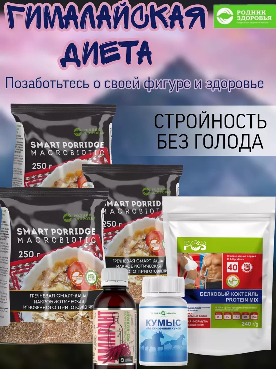 Программа «Гималайская диета» (60 порций) предназначена для решения задачи снижения веса в течение ограниченного времени (2-3 недели). При выполнении данной программы так же улучшается состояние сердечно-сосудистой системы, улучшается психоэмоциональное состояние.В неё входит Смарт - Каша гречневая В ней выраженное антиоксидантное действие, которое помогает в борьбе с болезнями.Насыщение организма легкоусвояемым белком.Улучшает работу пищеварительной системы за счёт высокого содержания растительных волокон.Контролирует уровень глюкозы, что предотвращает развитие диабета.Безопасна для людей с непереносимостью глютена. Содержит ценные минералы, витамины. Продукт быстрорастворимый. Амарантовое масло РОЗ - натуральный продукт, содержит сквален . Сквален подавляет рост раковых клеток, укрепляет иммунитет, способствует снабжению клеток кислородом, нормализует гормональный фон. Натуральный состав эффективно поддерживает молодость кожи, предотвращающий процессы старения во всех системах организма и в целом сохраняет физическое здоровье. Кумыс пробиотический комплекс на основе лошадиного молока , содержащие компоненты для поддержания работы желудка и кишечника , укрепления и повышения иммунитета.Природный пробиотик и пребиотик, оказывает детокс - действие, способствует очищению ЖКТ от токсинов, восстановлению естественной микрофлоры . Облегчает симптомы, связанные с пищеварительными расстройствами, такими как запор и вздутие, а также усвоению пищи. Пробиотик положительно скажется на качестве крови и сердечно-сосудистой системы. Витаминный комплекс обладает мощным противовоспалительным свойствам, повышает защитную функцию клеток, обеспечивает быстрый иммунный ответ, снижает восприимчивость организма к инфекциям и вирусам. Смарт коктейль - содержит сбалансированный белковый комплекс, а также витамины и минералы для организма.