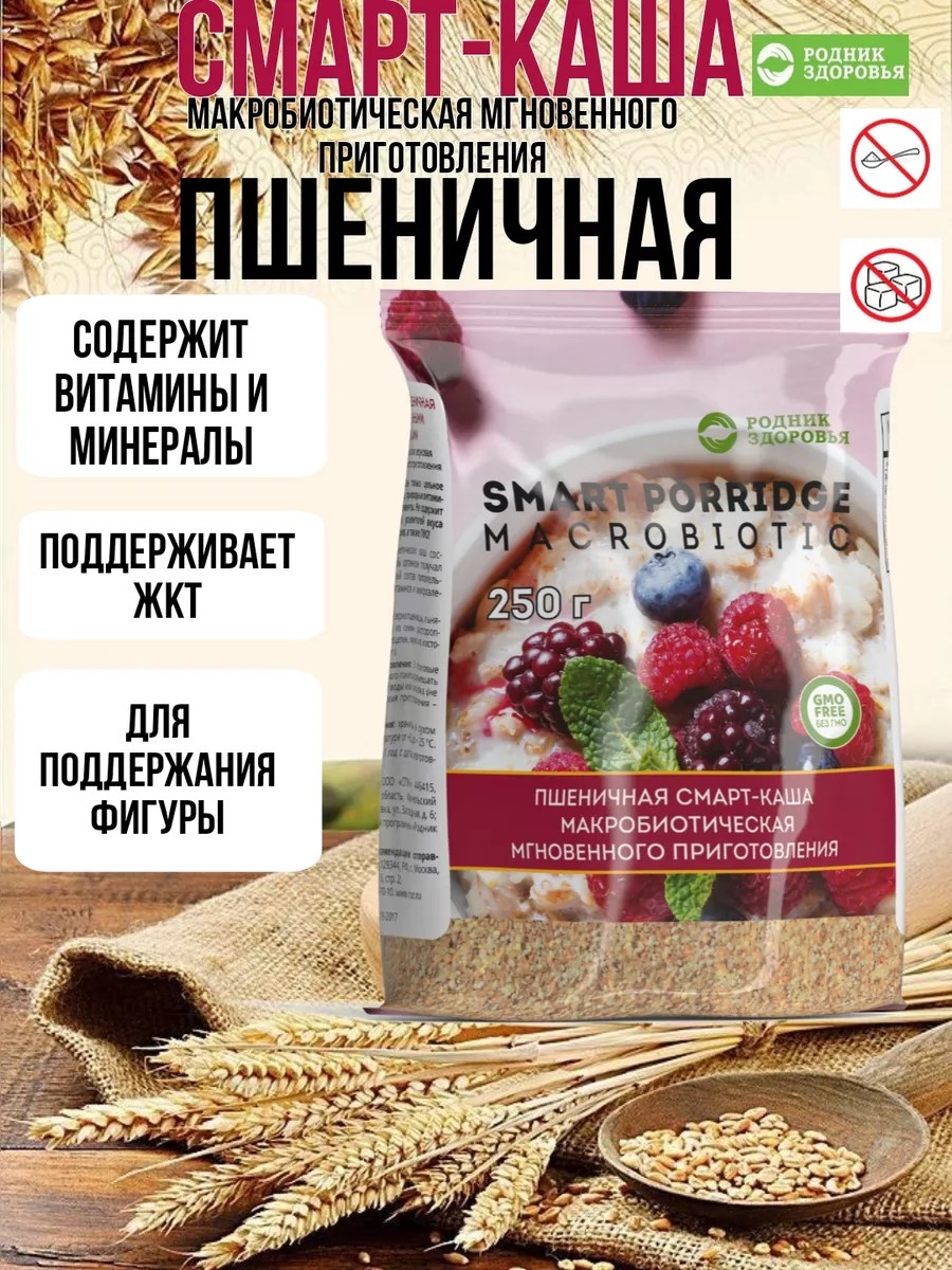 Пшеничную кашу можно назвать одним из самых известных во всем мире блюд. Для ее приготовления нужно минимум продуктов и времени, а на выходе получается вкусное и полезное блюдо.Пшенную крупу получают из проса, она содержит около 12% белка, 69,3% углеводов, 3,3% жиров, биологически активные аминокислоты и витамины В1, В2, В5, РР. Пшено является одним из основных поставщиков растительных белков и углеводов, содержит необходимые организму микроэлементы – железо, золото, фтор, магний, марганец, кремний, медь, кальций, калий и цинк. Пшено незаменимо в любом рационе, это доступный и традиционный продукт. Содержание клетчатки обеспечивает работу желудочно-кишечного тракта, очищает организм от шлаков, токсинов, снижает уровень холестерина в крови.В составе каши только цельное отборное зерно, природные витамины и микроэлементы.Рецепт макробиотических каш составлен так, чтобы организм получал сбалансированный состав питательных веществ, витаминов и микроэлементов.Вкусная и полезная СМАРТ-каша поможет вам сэкономить время, при этом насытить ваш организм полезными питательными веществами.В составе каши только цельное отборное зерно, природные витамины, микроэлементы и дигидрокверцетин.Чем полезна пшеничная крупа, знает каждый диетолог — несмотря на высокую калорийность, каша содержит ценные белки, аминокислоты, микроэлементы, жиры и клетчатку, поэтому ее обязательно включают в детское и лечебное меню. В состав пшеничной крупы также входят полезные минералы и витамины группы А, В, Е, С, РР, а среди ее полезных свойств стоит обязательно отметить способность укреплять иммунитет и восстанавливать силы.