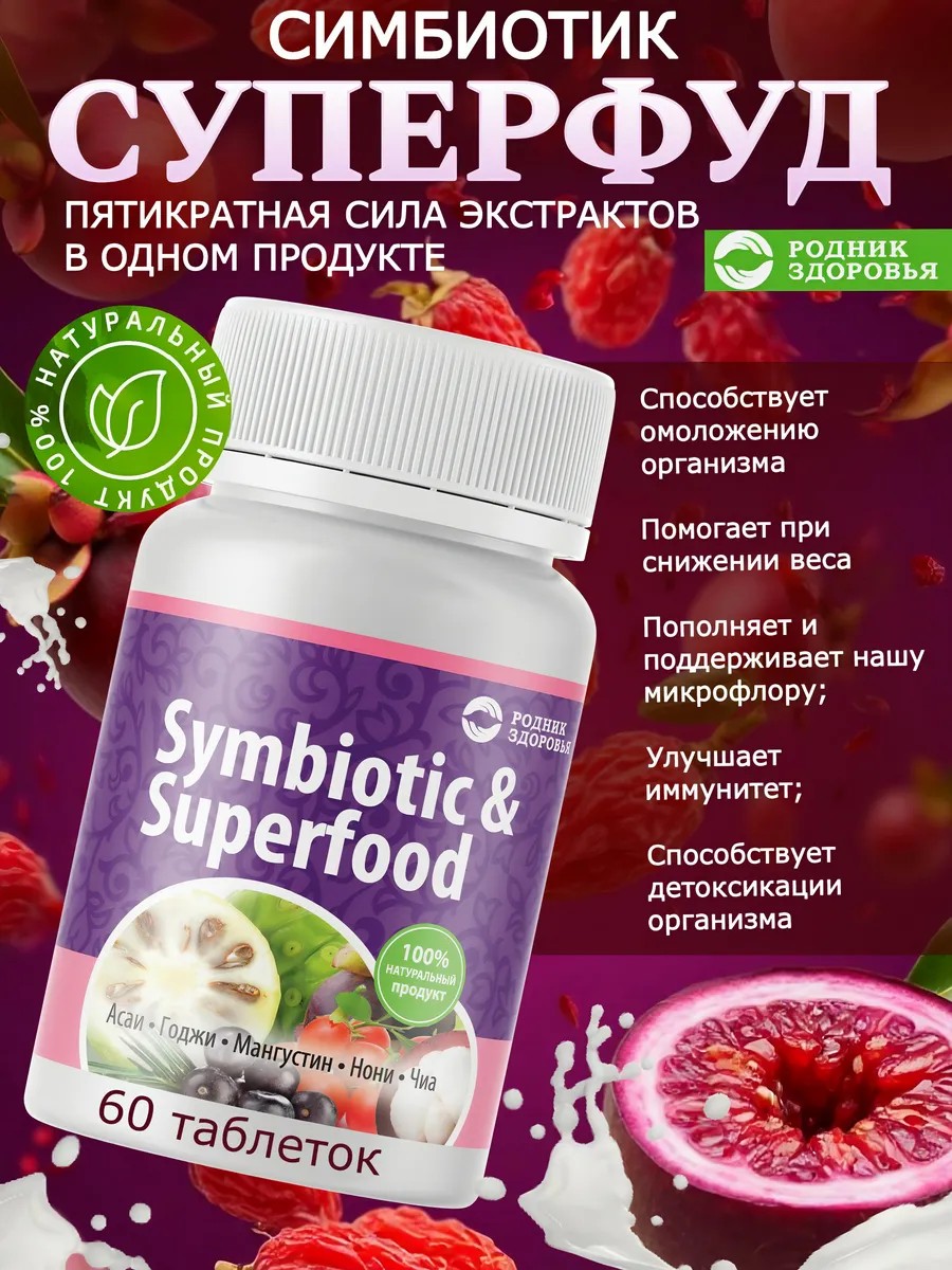Симбиотик Суперфуд от Родник Здоровья – это уникальное смешение пробиотиков и экзотических фруктов, созданное для поддержки здоровья и способствования похудению. Этот продукт сочетает в себе симбиотическую закваску, богатую жизненно важными бактериями, с насыщенными антиоксидантами годжи, нони, чиа, мангустином и асаи. Вкус этого суперфуда уникален и приятен благодаря сочетанию годжи, асаи и других экзотических фруктов, делая его отличным дополнением к вашему рациону. Симбиотик Суперфуд от Родник Здоровья поддерживает здоровье кишечника, способствует улучшению пищеварения и помогает в достижении целей похудения.Симбиотик суперфуд Родник Здоровья - Пробиотический комплекс, в составе которого находится более 40 штаммов полезных бактерий; а также экстракты Чиа, нони, мангустин, ягоды годжи, Асаи. БАД отлично зарекомендовал себя в улучшении пищеварения, схемах коррекции веса, укреплении иммунитета, улучшении эластичности сосудов и нормализации сна. Ягоды Годжи обладают жирсжигательным, сахароснижающим, гепатопротекторным действием. Асаи омолаживают организм и улучшают эластичность сосудов, способствуют снижению уровня холестерина в крови. Положительно влияет на состояние и работу сердечно-сосудистой системы, являются хорошей профилактикой атеросклероза, ишемической болезни и гипертонии. Улучшает пищеварения и работу ЖКТ, выводят токсины из организма. Семена Чиа за счёт высокого содержания омега-жиров облегчает боли во время менструаций. Жиры и белки выравнивают гормональный фон, облегчают период менопаузы. Восстанавливают работу желудочно-кишечного тракта, регулируют уровень сахара в крови, улучшают состояние кожи, волос и помогают избавится от депресси. Мангустин обладает противовоспалительным и антигистаминным действием, снижает уровень плохого холестерина и нормализует артериальное давление, что помогает снизить риск болезней сердца и сосудов. Витаминные и минеральные комплексы помогают поддерживать иммунную систему организма.Нони облегчает диабет, аллергию, астму, заболевание почек, геморрой, благодаря антиоксидантным свойствам действует как защитник в борьбе с воспалительными процессами. В комплексе все эти компоненты обладают синергическим действием. Витаминный комплекс суперфуд для похудения направлен на снижение лишнего веса, поддержание общего здоровья, улучшение обмена веществ и энергии. Симбиотик помогает не только похудеть , а поддерживать здоровье нервной системы и иметь полезные свойства для выносливости и спортивной производительности. Витамины для мужчин и женщин помогают регулировать уровень сахара в крови, подавляет аппетит и помогает ускорить обмен веществ, что снижает уровень жировых отложений и повышает энергетический потенциал.