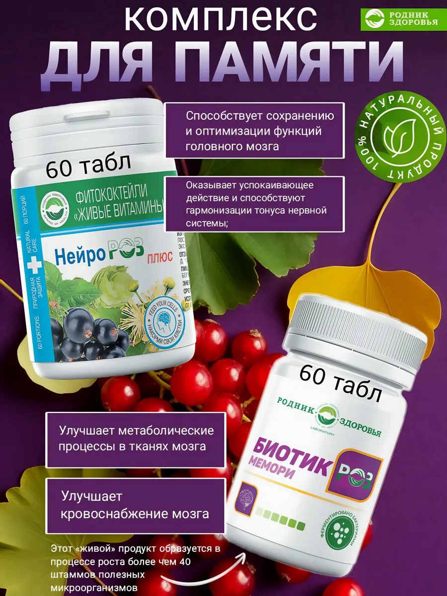 Биотики РОЗ» - это серия готовых к употреблению таблетированных продуктов питания. В их основе – многофункциональный пробиотик (симбиотическая закваска) и ферментированные лекарственные растения. БиотикРоз Мемори - пробиотик, БАД для мужчин и женщин, комплекс витаминов. Пробиотик улучшает мозговое кровообращение, доставку кислорода и питательных веществ к головному мозгу.Бады и витаминные комплексы для улучшения работы мозга, развития памяти и концентрации внимания. Натуральный состав помогаем получать энергию из углеводов и жиров, обеспечивают нормальную работу нервной системы, улучшают проводимость нейронов и скорость реакции, помогает улучшить поступление кислорода в мозг. Уникальный пробиотик противодействует старению мозга и деградации нервной системы, уменьшая симптомы депрессии, улучшая обучаемость и память, улучшает качество сна.