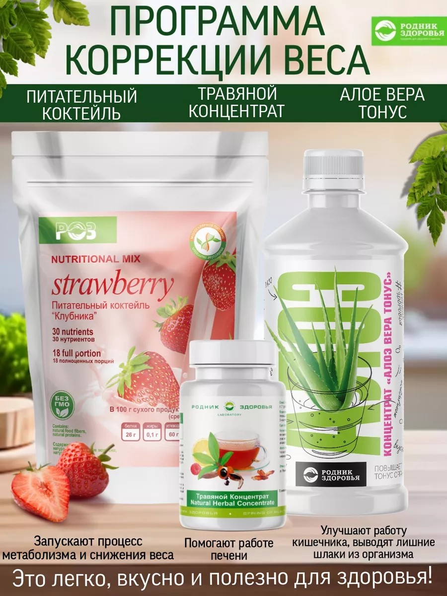 Комплекс состоит из Питательного коктейля Клубника, которым можно заменить 1-2 полноценных приема пищи (содержит минимум ккал. максимум пользы) , Геля Алоэ вера Тонус и Травяного концентрата.