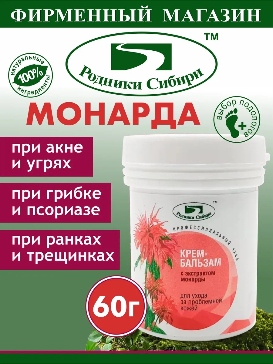 Крем-бальзам с монардой содержит биологически активный терпен живицы кедра, альфа-пинен, растворенный в масле, а также флавоноиды, смолы и эфирное масло монарды. Содержащиеся в монарде тимол, борниол, камфен и другие биологически активные вещества обладают выраженным противогрибковым и противомикробным действием. Область применения: онихолизисы разной этиологии, воспалительные процессы кожных мягких тканей, микоз кожи и ногтей, дерматомикоз, гипергидроз. Смягчает кожу, заживляет трещины. Применяется при акне, угревой сыпи, экземе, себореи, перхоти, шелушении кожи, псориазе. Действие: антибактериальное, противогрибковое, восстанавливающее, тонизирующее. Способ применения: нанести на кожу тонкий слой крема и втирать массажными движениями до полного впитывания. Процедура проводится 1-2 раза в день в течение 20 -30 дней. Могут быть перерывы не более чем на 1-2 дня. Для обеспечения более стойкого эффекта рекомендуется повторное применение крема не позже, как через 3 месяца.