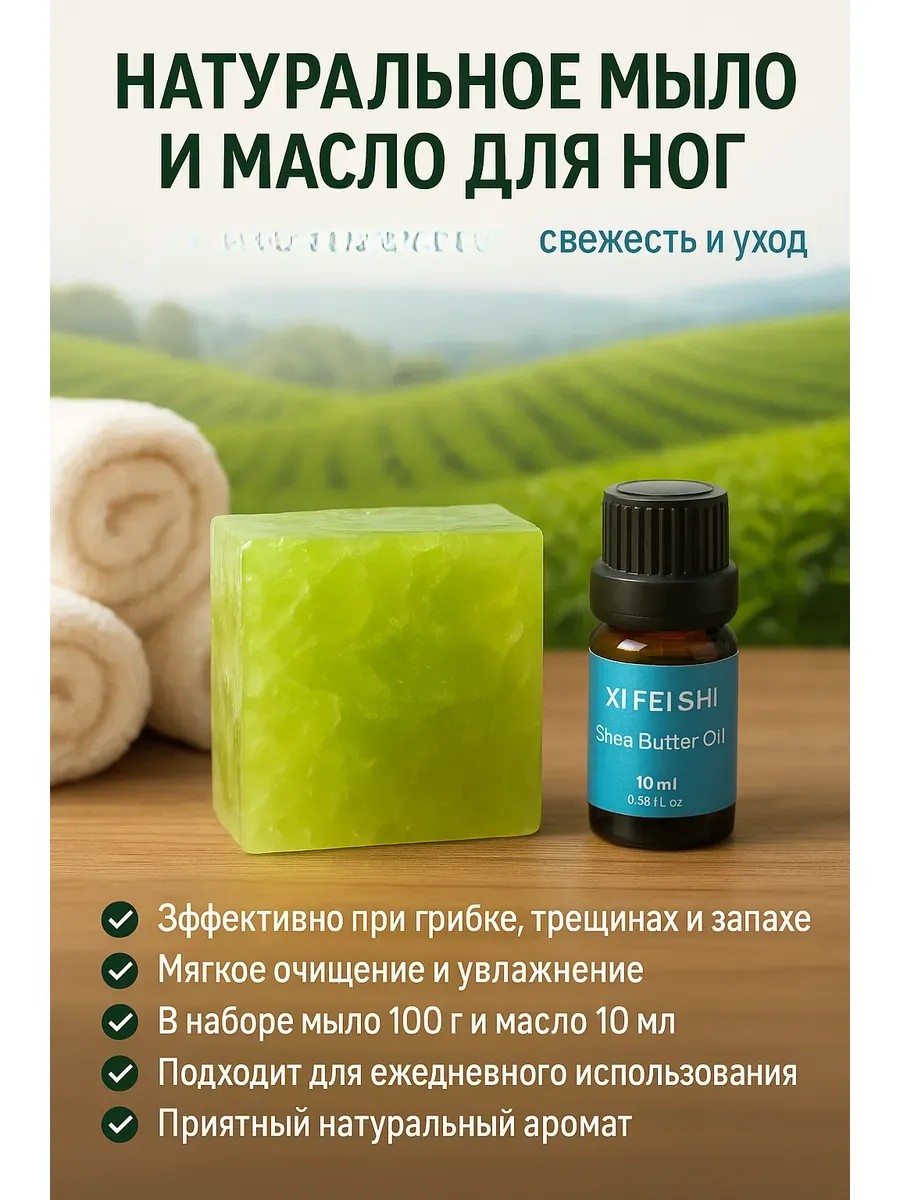 | Полное наименование товара | Натуральное мыло для ног и масло ши XI FEI SHI, от грибка, трещин и запаха, увлажняющее, 100 г + 10 мл |