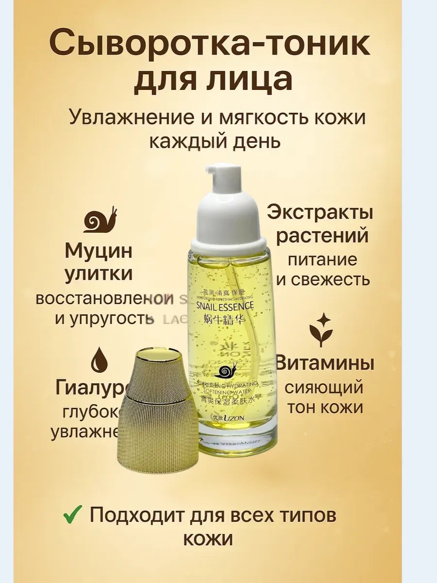 Сыворотка-тоник для лица с муцином улитки – современное средство для ухода за кожей, которое сочетает в себе свойства увлажняющего тоника и питательной сыворотки. Благодаря уникальной формуле на основе натуральных компонентов средство мягко воздействует на кожу, помогает восстановить её естественный баланс, увлажнить и вернуть сияющий тон.