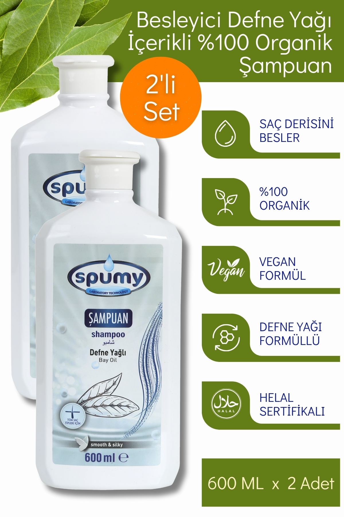 Spumy Besleyici Defne Yagi Içerikli 2'li 100 Organik Sampuan - 600 ML x 2 Adet