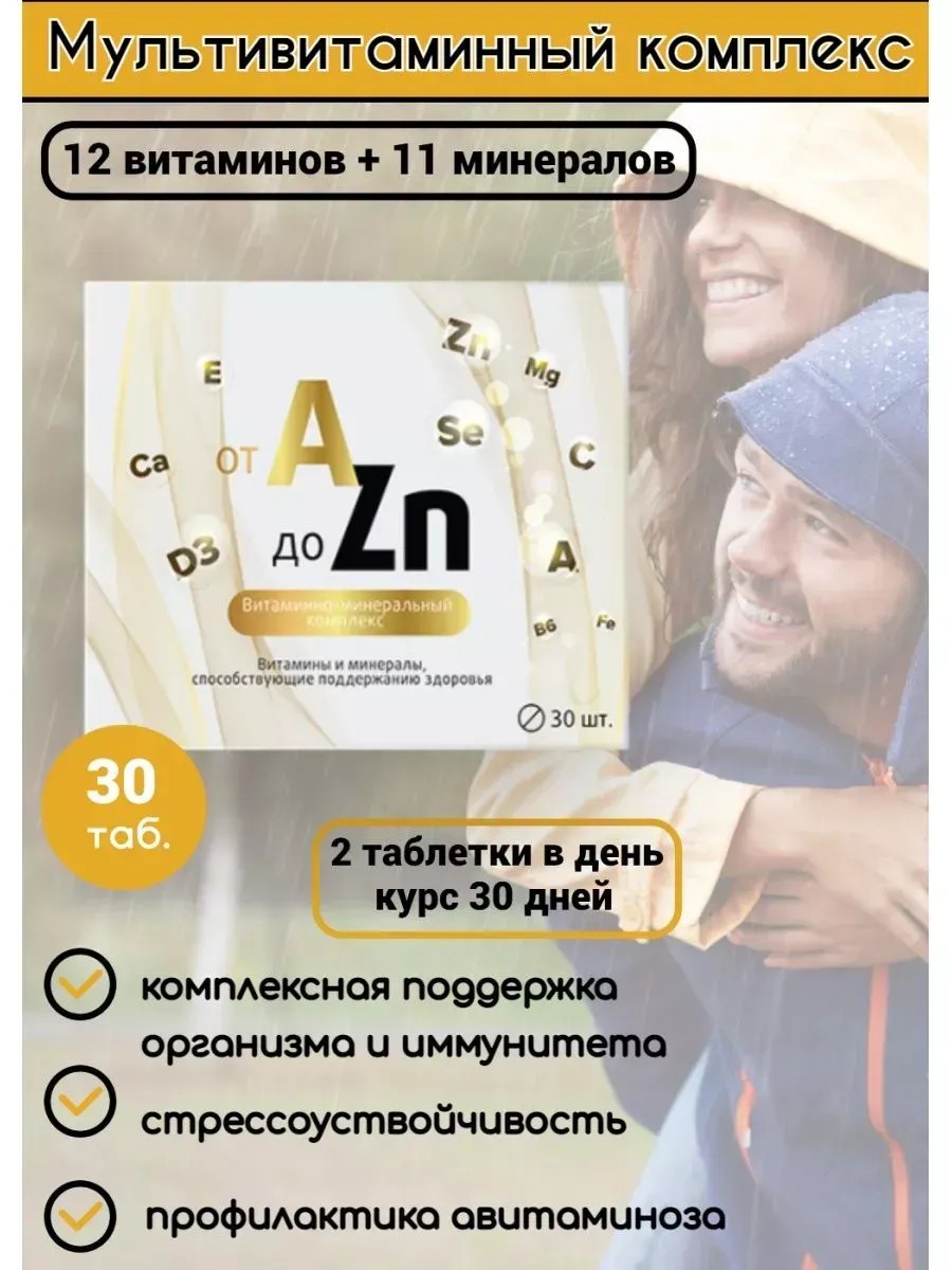 Витаминно-минеральный комплекс от А до цинка разработан для современного человека, с учётом его потребностей. Мультивитамины помогут сохранить хорошее самочувствие и жизненный тонус. Известно, что если витамины и минералы находятся на достаточном уровне - это обеспечивает сопротивление иммунной системы инфекционным заболевания, а значит человек меньше болеет. Комплекс от A до Zn — применяется в качестве биологически активной добавки к пище. Прием витаминно-минерального комплекса от А до Zn будет полезен при дефиците витаминов, минералов и микроэлементов; при недостаточном поступлении витаминов и минералов с пищей, например: во время постов, при соблюдении любых диет; в период восстановления после болезней; при повышенных физических нагрузках; при эмоциональных и умственных нагрузках; в стрессовых ситуациях. СПОСОБ ПРИМЕНЕНИЯ И ДОЗЫ: взрослым и детям старше 14 лет по 1 таблетке 2 раза в день во время еды. Продолжительность приема - 1 месяц. При необходимости прием можно повторить.