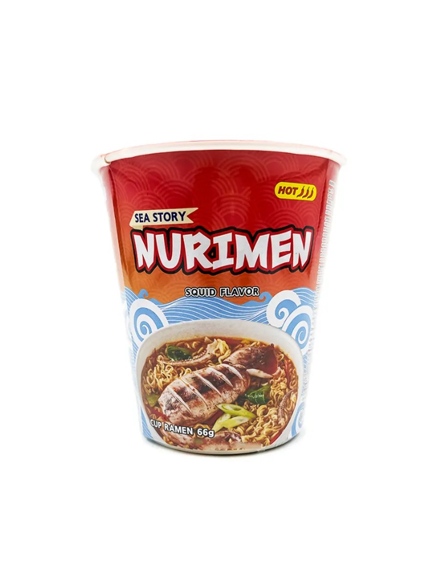 Nurimen Spicy Squid Flavored Instant Noodles, 66g. Nurimen Spicy Squid Flavored Instant Noodles are dense, elastic, and delicious wheat noodles in a rich, spiced-up broth with the rich flavor of squid and seafood. They're perfect for those who appreciate spicy noodles and seafood in warming broths. The broth is generously seasoned with chili, ground black pepper, garlic, onion, and hot chili oil, and complemented with vegetables like cabbage, carrots, and seaweed. The deep, multifaceted flavor of this noodle soup from the Korean brand Nurimen will be appreciated by lovers of Korean food and the new flavors of Asian cuisine. The noodles cook in 2 minutes in the microwave, or 4 minutes if simply poured with boiling water and covered.