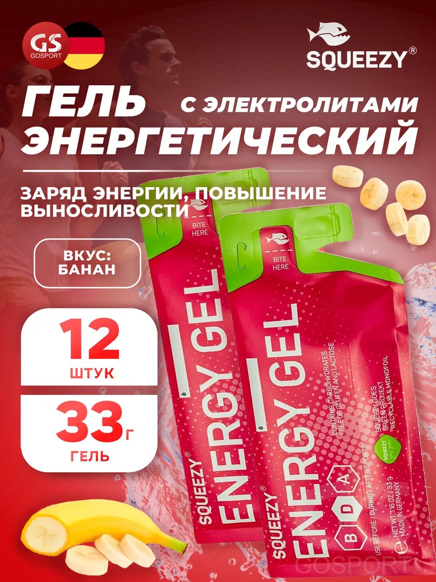 Энергетический гель с электролитами ENERGY GEL no caffeine 33 г x 12 саше, Банан. Гели Squeezy Energy gel no caffeine предлагают спортсменам, занимающимся выносливостью, разумное решение для профессионального поддержания работоспособности во время тренировок и соревнований. Формулы Squeezy Energy gel следуют четкой философии, которая запрещает искусственные и ненужные ингредиенты, а также красители и вообще отвергает все, что может каким-либо образом повлиять на переносимость желудка. Гели содержат особенно низкую концентрацию растворенных частиц (низкая осморальность) и многоступенчатое выделение энергии для надежного энергоснабжения за счет высококачественной углеводной смеси. Идеально подходит для: видов спорта на выносливость с продолжительными упражнениями продолжительностью 45 минут и более. Энергетические потребности мышц во время упражнений на выносливость не могут быть полностью покрыты организмом самое позднее через 90 минут. Современные рецепты, такие как Squeezy Energy Gel, удовлетворяют эту потребность и обеспечивают организм сложными углеводами и минералами. Каждый продукт содержит несколько источников углеводов, которые своевременно обеспечивают организм энергией в краткосрочной и среднесрочной перспективе. Натрий и калий восполняют то, что теряется при потоотделении. Squeezy Energy Gel с электролитами является компонентом профессионального спортивного питания для спортсменов и людей, занимающихся спортом или фитнесом. Продукт подходит для мужчин и женщин, заботящихся о своем здоровье и красоте. Рекомендации к применению гелей саше: употреблять 2–3 энергетических геля в час физической нагрузки, запивая каждый 150–250 мл воды. Гель в флаконе: потреблять около 60–90 мл геля за час физической нагрузки. После употребления около 30 мл геля обычно следует запить 150–200 мл воды.