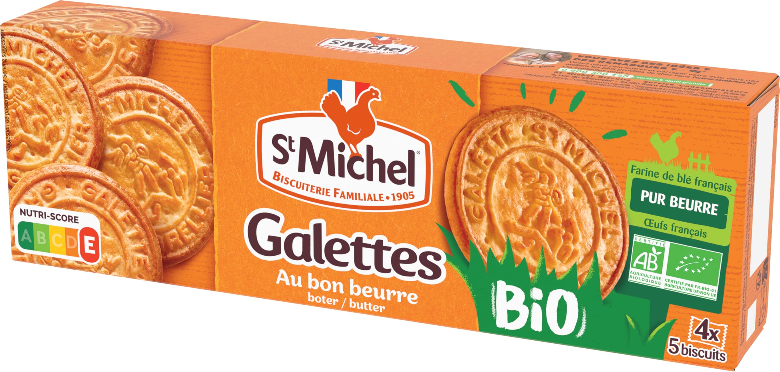 Rediscover the famous taste of the St Michel galette with organic ingredients! Crispy and melting galettes with good organic butter. St Michel bio, an organic product with taste and meaning: made in France, with French wheat flour, French eggs and without palm oil, like all our St Michel products. St Michel, French biscuits of gourmet origin! This case contains 4 bags of 5 galettes. INGREDIENTS WHEAT flour 66 , cane sugar , BUTTER 16 , EGGS 2.5 , raising agents: ammonium and sodium carbonates - citric acid, natural flavoring, gray sea salt, skimmed MILK powder . Ingredients from organic farming. Possible traces of soy, sesame seeds and nuts INSTRUCTIONS FOR USE Store in a dry place away from heat ST MICHEL: Creating good products, well made with good ingredients: this is the trademark that makes our reputation. WHERE: We make them in our family biscuit factory in the west of France. IN DETAIL: wheat flour 66 , cane sugar , butter 16 , eggs 2.5 , raising agents: ammonium and sodium carbonates - citric acid, natural flavoring, gray sea salt, skimmed milk powder . Ingredients from organic farming. Possible traces of soy, sesame seeds and nuts. GOOD PRODUCTS: St Michel bio, an organic product with taste and meaning: made in France, with French wheat flour, French eggs and no palm oil. RECIPE: Rediscover the famous taste of the St Michel Galette with organic ingredients! Retrouvez le fameux goût de la galette St Michel avec des ingrédients bio! Des galettes croustillantes et fondantes au bon beurre bio. St Michel bio, un bio qui a du goût et du sens : fabriqué en France, avec de la farine de blé français, des œufs français et sans huile de palme, comme tous nos produits St Michel. St Michel, biscuits français d'origine gourmande! Cet étui contient 4 sachets de 5 galettes. INGRÉDIENTS farine de BLÉ 66 , sucre de canne , BEURRE 16 , ŒUFS 2.5 , poudres à lever : carbonates d'ammonium et de sodium - acide citrique, arôme naturel, sel marin gris, LAIT écrémé en poudre . Ingrédients issus de l'agriculture biologique. Traces éventuelles de soja, de graines de sésame et fruits à coque MODE D'EMPLOI À conserver au sec et à l'abri de la chaleur ST MICHEL : Créer des bons produits, bien faits avec de bons ingrédients : voilà la marque de fabrique qui fait notre renommée. OÙ : Nous les fabriquons dans notre biscuiterie familiale dans l'ouest de la France. EN DETAIL : farine de blé 66 , sucre de canne , beurre 16 , oeufs 2.5 , poudres à lever : carbonates d'ammonium et de sodium - acide citrique, arôme naturel, sel marin gris, lait écrémé en poudre . Ingrédients issus de l'agriculture biologique Traces éventuelles de soja, de graines de sésame et fruits à coque. DE BONS PRODUITS : St Michel bio, un bio qui a du goût et du sens : fabriqué en France, avec de la farine de blé français, des oeufs français et sans huile de palme. RECETTE : Retrouvez le fameux goût de la Galette St Michel avec des ingrédients bio !.