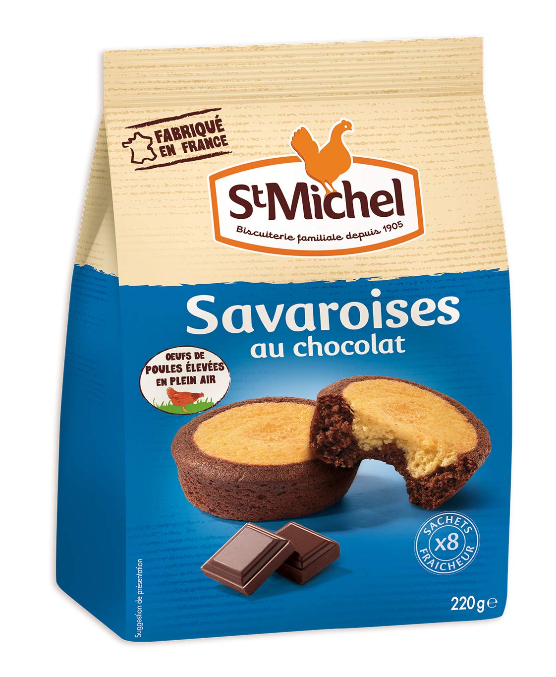 Discover our Savaroises, the combination of a soft dough and a delicious chocolate dough. A simple and authentic recipe with good ingredients: free-range eggs, French wheat flour from a sustainable source, without palm oil. Practical freshness sachets for a gourmet break at any time of the day. We make them in our family biscuit factory in Commercy, Lorraine. St Michel, French biscuits of gourmet origin! INGREDIENTS sugar, EGGS, WHEAT flour 18 , BUTTER, rapeseed oil, glucose syrup, stabilizers: sorbitols and glycerol, chocolate 5.1 (cocoa mass, sugar, emulsifier: lecithins (SOY)), cocoa powder, raising agents: sodium carbonates and citrates (WHEAT), salt, flavoring, dextrose DIRECTIONS FOR USE Keep in a dry place, away from heat and light Made in our family biscuit factory in Commercy, Lorraine. Made in France. Practical freshness pouches for a delicious snack at any time of day. Discover our Savaroises, a combination of soft dough and delicious chocolate. Découvrez nos Savaroises, l'association d'une pâte moelleuse et d'une pâte au bon chocolat. Une recette simple et authentique avec de bons ingrédients : des oeufs de poules élevées en plein air, de la farine de blé français issu d'une filière durable, sans huile de palme. Des sachets fraîcheur pratiques pour une pause gourmande à tout moment de la journée. Nous les fabriquons dans notre biscuiterie familiale à Commercy, en Lorraine. St Michel, biscuits français d'origine gourmande ! INGRÉDIENTS sucre, ŒUFS, farine de BLÉ 18 , BEURRE pâtissier, huile de colza, sirop de glucose, stabilisants : sorbitols et glycérol, chocolat 5.1 (pâte de cacao, sucre, émulsifiant : lécithines (SOJA)), cacao en poudre, poudres à lever : carbonates et citrates de sodium (BLÉ), sel, arôme, dextrose MODE D'EMPLOI Tenir au sec, à l'abri de la chaleur et de la lumière Fabriqué dans notre biscuiterie familiale à Commercy, en Lorraine. Fabriqué en France. Des sachets fraicheur pratiques pour une pause goourmande à tout moment de la journée. Découvrez nos Savaroises, l'association d'une pâte moelleuse et d'une pâte au bon chocolat.