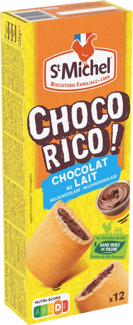 For children's afternoon snacks, choose our Chocorico cookies, shortbread-textured biscuits with a delicious milk chocolate center. Why are they so good? Made with real milk chocolate, no palm oil, and French wheat flour. INGREDIENTS Wheat flour 36.9 , sugar, rapeseed oil, milk chocolate 8 (whole milk powder, fat-reduced cocoa powder, cocoa mass, sugar), vegetable oils (rapeseed, sunflower, coconut, in varying proportions), pastry butter, modified starch, vegetable fibers (wheat, chicory), fat-reduced cocoa powder, starch, emulsifier: lecithins (soy), flavoring, skimmed milk powder, raising agent: ammonium carbonates, salt, natural vanilla flavoring, antioxidant: tocopherolsST MICHEL - Chocorico au chocolat au lait - Lot de 12 paquets de 225gDESCRIPTION DU PRODUIT DESCRIPTION DU PRODUIT Pour le goûter des enfants, choisissez nos Chocorico, des gâteaux à la texture sablée au cœur gourmand de chocolat au lait. Pourquoi c'est trop bon ? Au bon chocolat au lait, sans huile de palme, farine de blé français. INGRÉDIENTS farine de blé 36,9 , sucre, huile de colza, chocolat au lait 8 (lait entier en poudre, cacao maigre en poudre, pâte de cacao, sucre), huiles végétales (colza, tournesol, coprah, en proportion variable), beurre pâtissier, amidon modifié, fibres végétales (blé, chicorée), cacao maigre en poudre, amidon, émulsifiant : lécithines (soja), arôme, lait écrémé en poudre, poudre à lever : carbonates d'ammonium, sel, arôme naturel de vanille, antioxydant: tocophérols