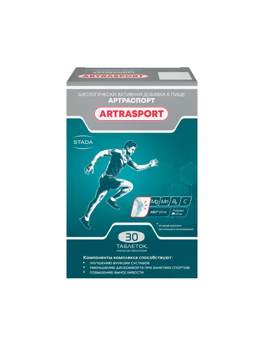 Биологически активная добавка к пище "Артраспорт" - содержит компоненты, которые способствуют уменьшению скованности движения, улучшению функции сустава. "Артраспорт" усилен антиоксидантами, которые повышают тренировочный эффект и особенно хорошо может подойти людям, активно занимающимся спортом. ASU (неомыляемые фракции масел авокадо и соевых бобов) содержит биологически активные вещества фитостерины - фитостерол, бета-ситостерин, кампестерол и стигмастерол. ASU относятся к натуральным хондропротекторам - веществам, способствующим защите суставов и ингибирующих медиаторы, вызывающие воспаление и дегенерацию хряща. В 2014 году был опубликован обзор, посвященный пероральным травяным препаратам для суставов. В обзор был включен ряд исследований. Авторы пришли к выводу, что ASU уменьшает воспаление и скованность при одновременном улучшении функции сустава и приводит к уменьшению потребности в приеме других средств. Robuvit (экстракт древесины дуба черешчатого) содержит биологически активные вещества полифенолы. Антиоксидантная способность добавок с компонентом Robuvit в составе оценивалась в исследовании с участием 61 спортсмена-любителя триатлона, мужчин и женщин. Оно показало, что двухнедельный прием таких добавок может улучшить тренировочный эффект, уменьшить усталость после тренировки и облегчить восстановление. Витамин С, аскорбиновая кислота является природным антиоксидантом, который важен для людей, занимающихся спортом. Витамин В6 необходим для обмена аминокислот, принимает участие в жировом и липидном обмене, улучшает усвоение ненасыщенных жирных кислот. Необходим для повышения устойчивости к стрессу. Магний и марганец - дополнительные компоненты для обновления тканей.