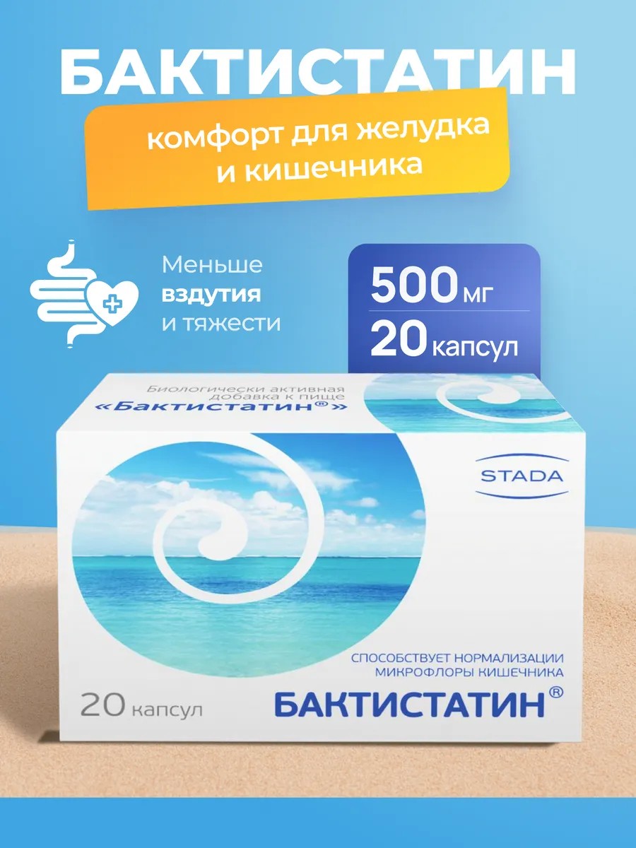Бактистатин - это биологически активная добавка к пище предназначенная для улучшения функционального состояния желудочно-кишечного тракта, при: - дисбактериозах (дисбиозах) кишечника, возникающих в результате антибиотикотерапии, при хронических заболеваниях желудочно-кишечного тракта, после перенесенных кишечных инфекций, после лучевой и химиотерапии; - гастрите, гастродуодените; - хроническом панкреатите; - синдроме раздраженного кишечника; - диспепсии (тошнота, изжога, жидкий стул); - гиперхолестеринемии; - аллергических и дерматологических заболеваниях (аллергическом дерматите); - кишечных инфекциях; - воздействии неблагоприятных факторов для повышения неспецифической резистентности организма.