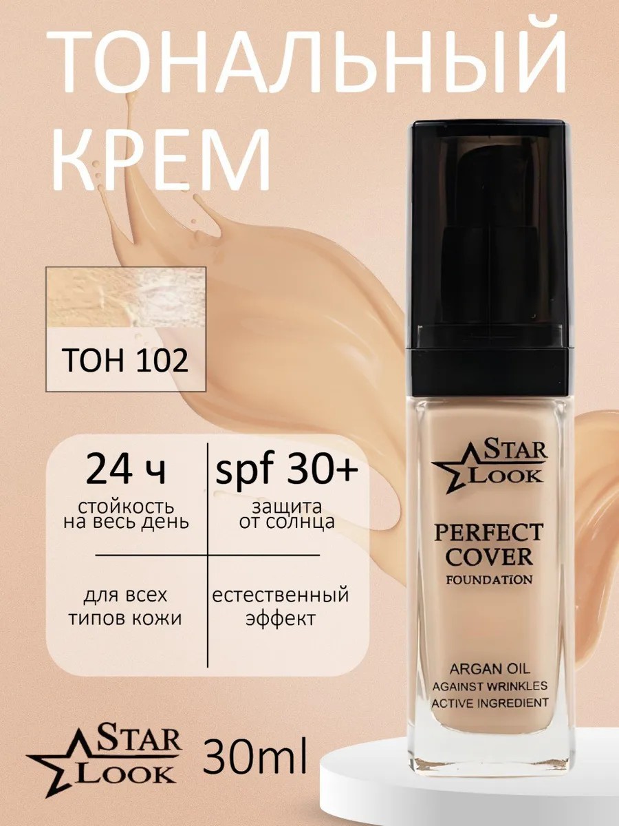 Косметика Star Look представляет собой идеальное решение для создания макияжа.Тональный крем обеспечит вам безупречный вид и надежную защиту от солнца. Его кремовая текстура легко наносится и равномерно распределяется, создавая естественное покрытие, которое тонирует кожу и обновляет ее цвет. SPF 30+ защитит вашу кожу от вредных UVA/UVB лучей, предотвращая преждевременное старение. Благодаря водостойкой формуле, макияж останется безупречным в течение всего дня. Тональная основа подходит для всех типов кожи, в том числе для нормальной и сухой, и может использоваться не только на лице, но и на шее, декольте, а также коже головы. Аргановое масло в составе питает и увлажняет кожу, оставляя ее мягкой и бархатистой.