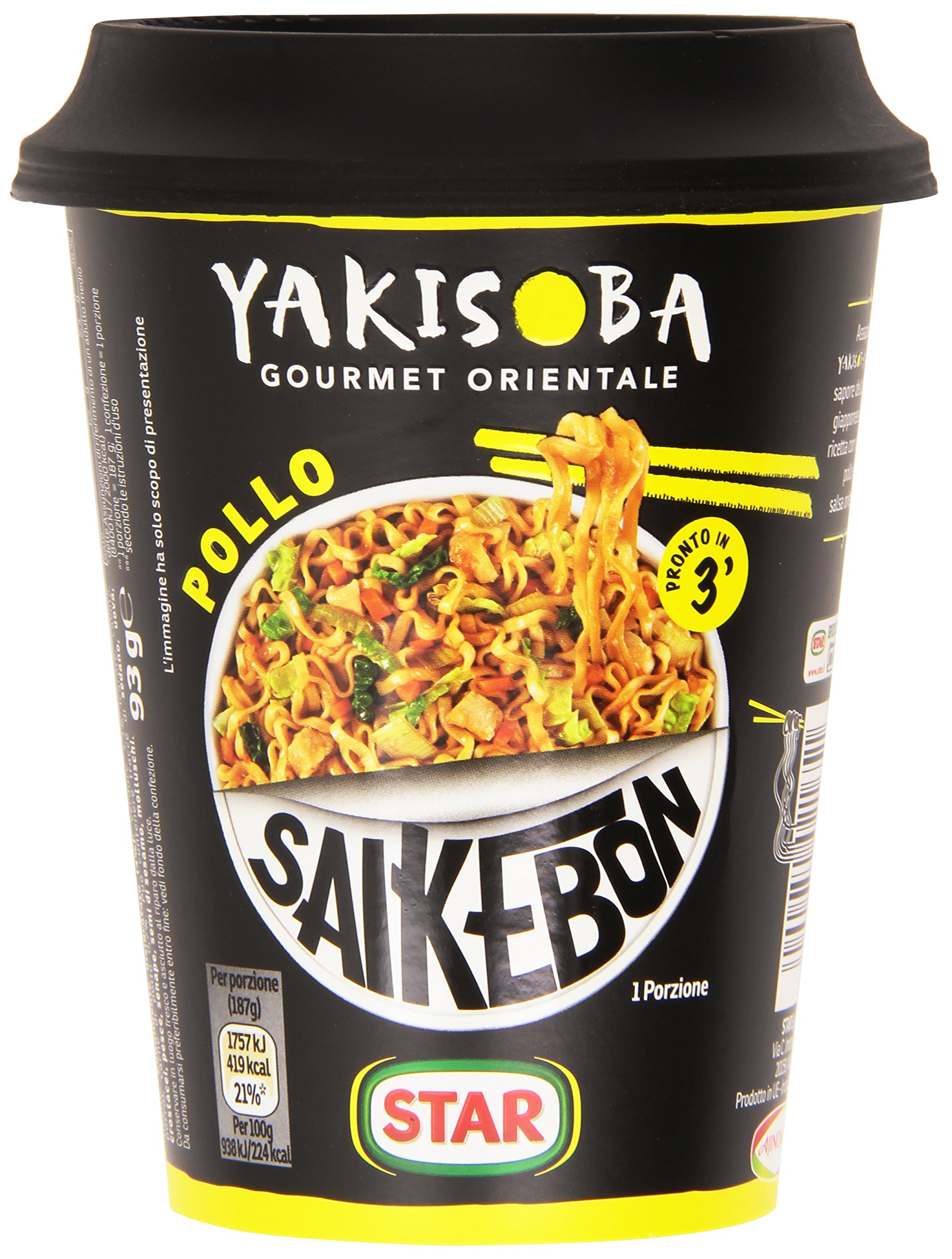 Star reinvents the new way to eat. Saikebon is a surprise, fun, and tantalizing treat for the taste buds. You can enjoy it anywhere you want without making a mess in the kitchen. Delivered in a convenient cup, ideal for enjoying at home and on the go. Open the protective film in two parts and add the contents of the bag inside the container. Pour boiling water up to the indicated line in the container. Close the lid and let it sit for 3 minutes. Stir gently. Dehydrated product. Store in a cool, dry place away from light. Instant noodles (90 ): wheat flour, palm oil, modified starch, salt, raising agents: sodium carbonate, potassium carbonate. Powdered seasoning (10 ): table salt, potato starch, flavor enhancers: E621, E635, lactose, sugar, vegetables in varying proportions 2 (carrots, celery, pear), yeast extract, flavorings (containing gluten, eggs, and milk), chicken fat 1.5 , parsley, colors: E150c, E160c, E100 white pepper, soy sauce powder [soy sauce, wheat, salt], maltodextrin, salt], chicken meat 0.5 , acidity regulator: citric acid. May contain traces of: crustaceans, fish, mustard, sesame seeds, and sweetener. Nutritional values per 100g: Energy 938 kJ 1757 kJ - Fat 10g of which: saturates 4.7g Carbohydrate 28g of which: sugars 3.7g Fiber 1.5g Protein 4.7g Salt 1.2g. INGREDIENTS Instant noodles (90 ): wheat flour, palm oil, modified starch, salt, raising agents: sodium carbonate, potassium carbonate. Seasoning powder (10 ): table salt, potato starch, flavor enhancers: E621, E635 Lactose, sugar, vegetables in varying proportions 2 (carrots, celery, leeks), yeast extract, flavorings (containing gluten, eggs, and milk), chicken fat 1.5 , parsley, colors: E15 , E150c, E150c, E150c, E150c, E150c, E15 , parsley, E15 , E100 white pepper, soy sauce powder (soy sauce, wheat, salt), maltodextrin, salt], chicken meat 0.5 , acidity regulator: citric acid. May contain traces of: crustaceans, fish, mustard, sesame seeds, mollusks.Star Saikebon Noodles Yakisoba Pollo Plat japonais Composé de pâtes, de poulet et de légumes 93gDESCRIPTION DU PRODUIT DESCRIPTION DU PRODUIT Star réinvente la nouvelle façon de manger Saikebon est une surprise, amusant et chatte le palais. Vous pouvez en profiter partout où vous le souhaitez sans salir la cuisine. Livré dans un gobelet pratique, idéal pour le plaisir à la maison et en déplacement. Ouvrez le film protecteur en deux parties et ajoutez le contenu du sac qui se trouve à l'intérieur du récipient. Versez de l'eau bouillante jusqu'à la ligne affichée dans le récipient. Fermez le couvercle et laissez reposer pendant 3 minutes. Mélangez doucement. Produit déshydraté. Conserver dans un endroit frais et sec à l'abri de la lumière. Nouilles instantanées (90 ) : farine de blé, huile de palme, amidon modifié, sel, agent de levage: carbonate de sodium, carbonate de potassium. Assaisonnement en poudre (10 ) : sel alimentaire, amidon de pomme de terre, exhausteur de goût : E621, E635, lactose, sucre, légumes en proportions modifiables 2 (carottes, céleri, poir), extrait de levure, arômes (contenant du gluten, des œufs et du lait), graisse de poulet 1,5 , persil, colorants : E150c, E160c E100 Poivre blanc, sauce soja en poudre [sauce de soja, blé, sel), maltodextrine, sel], viande de poulet 0,5 , régulateur d'acidité : acide citrique. Peut contenir des traces de : crustacés, poissons, moutarde, graines de sésame et adoucissant. Valeurs nutritionnelles pour 100 g : énergie 938 kJ 1757 kJ - Matières grasses 10 g dont : acides gras saturés 4,7 g glucides 28 g dont sucre 3,7 g de fibre 1,5 g de protéines 4,7 g de sel 1,2 g. INGRÉDIENTS Nouilles instantanées (90 ): farine de blé, huile de palme, amidon modifié, sel, levant: carbonate de sodium, carbonate de potassium. Poudre de condiment (10 ) : sel de table, fécule de pomme de terre, exhausteur de goût : E621, E635 lactose, sucre, légumes en proportions variables 2 (carottes, céleri, poireaux), extrait de levure, arômes (contenant du gluten, des œufs et du lait), graisse de poulet 1,5 , persil, colorants : E15 , E150c, E150c, E150c, E150c, E150c, E15 , persil, E15 , 0C, E10 0 poivre blanc, sauce soja en poudre [sauce soja, blé, sel), maltodextrine, sel], viande de poulet 0,5 , régulateur d'acidité: acide citrique. Peut contenir des traces de: crustacés, poissons, moutarde, graines de sésame, mollusques.