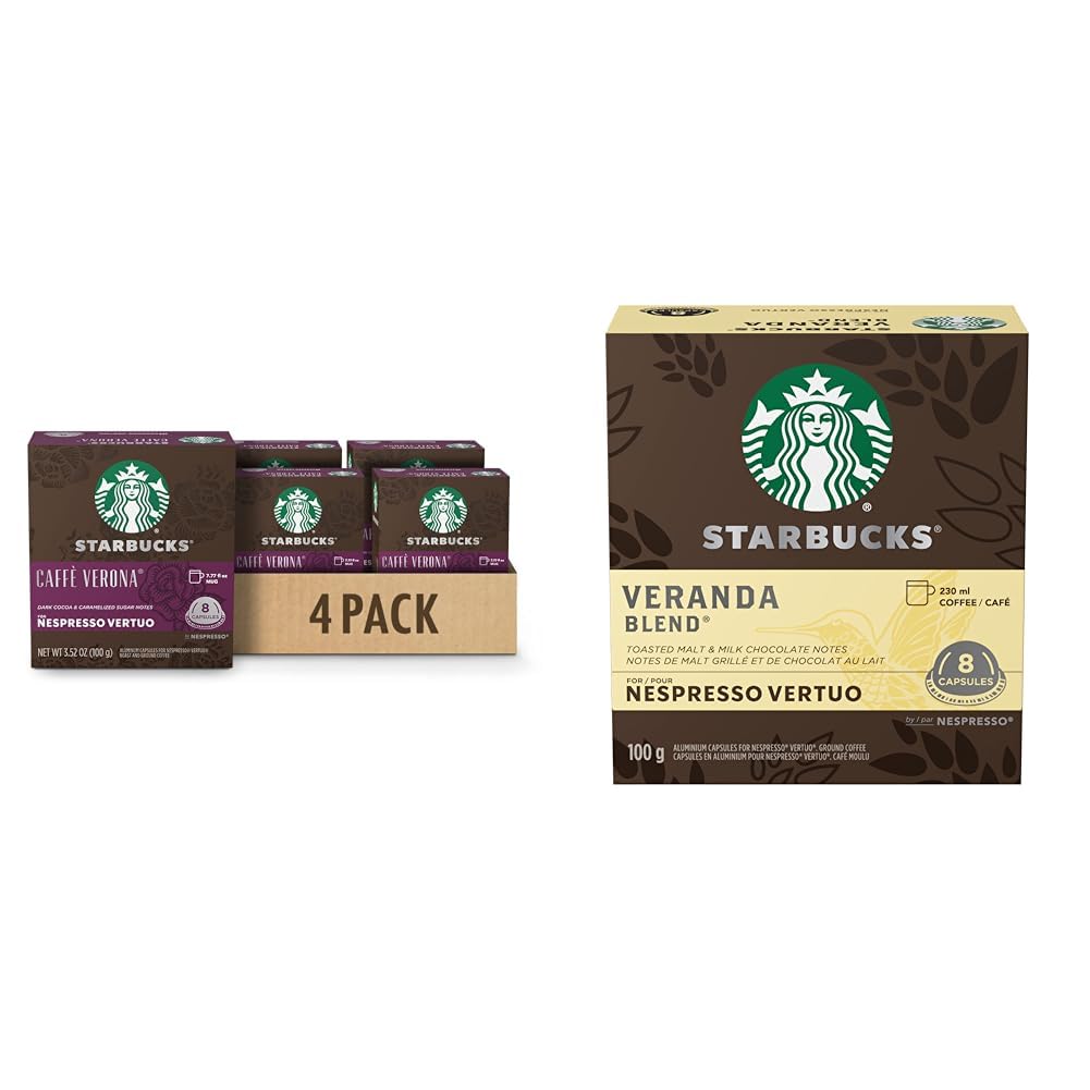 Starbucks By Nespresso Caffè Verona Coffee Pods, Dark Roast, Nespresso Vertuo Line Compatible Capsules, 4 X 8 Coffee Pods, 32 Count Enjoy the authentic café taste of Starbucks coffee at home like never before on Nespresso Vertuo machines. Made with the finest quality Starbucks coffee that you know and love, Starbucks capsules are developed with Nespresso to work perfectly with the Nespresso Vertuo system and are fully recyclable through the Nespresso recycling program. Each cup of Starbucks Caffè Verona dark roast Coffee is bold and full-bodied, made with 100 arabica coffee beans, and perfect for every day. Starbucks by Nespresso Veranda Blend Blonde Roast Coffee Pods, Nespresso Vertuo Line Compatible Capsules, 8 Coffee Pods In Latin America, coffee farms are often run by families, with their own homes on the same land where their coffee grows. We've sipped coffee with these farmers for decades, sitting on their verandas, overlooking the lush beauty of the coffee trees rolling out in the distance. Most times it was a lightly roasted coffee like this one. It took us more than 80 tries to get it right—mellow and flavourful with a nice softness. Enjoy the authentic café taste of STARBUCKS coffee at home like never before on NESPRESSO VERTUO machines. Made with the finest quality STARBUCKS coffee that you know and love, STARBUCKS capsules are developed with NESPRESSO to work with the NESPRESSO VERTUO system and are easily recyclable through the NESPRESSO recycling program. Each cup of STARBUCKS VERANDA BLEND blonde roast coffee is mellow and soft and made with 100 Arabica coffee beans. Authentically delicious perfection is just a cup away.Product 2: Recyclable: STARBUCKS by NESPRESSO capsules are made from aluminum and easily recyclable through the NESPRESSO recycling program. Product 2: STARBUCKS Quality At Home: Enjoy the high-quality STARBUCKS coffee that you know and love with this box of 8 NESPRESSO VERTUO coffee capsules. Product 2: Brew Size: Each STARBUCKS capsule for NESPRESSO VERTUO machines easily brews 230mL of coffee. Product 2: Inspired Tastes: STARBUCKS VERANDA BLEND for NESPRESSO VERTUO is a blonde roast coffee that has a profile level intensity of 6 with mellow and soft notes It is made with a blend of Latin American coffee beans. Product 1: Recyclable: Starbucks by Nespresso capsules are made from aluminum and fully recyclable through the Nespresso recycling program. Product 1: Starbucks quality at home: enjoy the high-quality Starbucks coffee that you know and love with this box of 8 Coffee capsules. Product 1: BREW SIZE: Each Starbucks capsule for Nespresso Vertuo machines easily brews a 230 ml mug. Product 1: Inspired tastes: bold and full-bodied, caffè Verona is a dark roast coffee with a profile level intensity of 10 and has notes of dark cocoa and caramelized sugar.