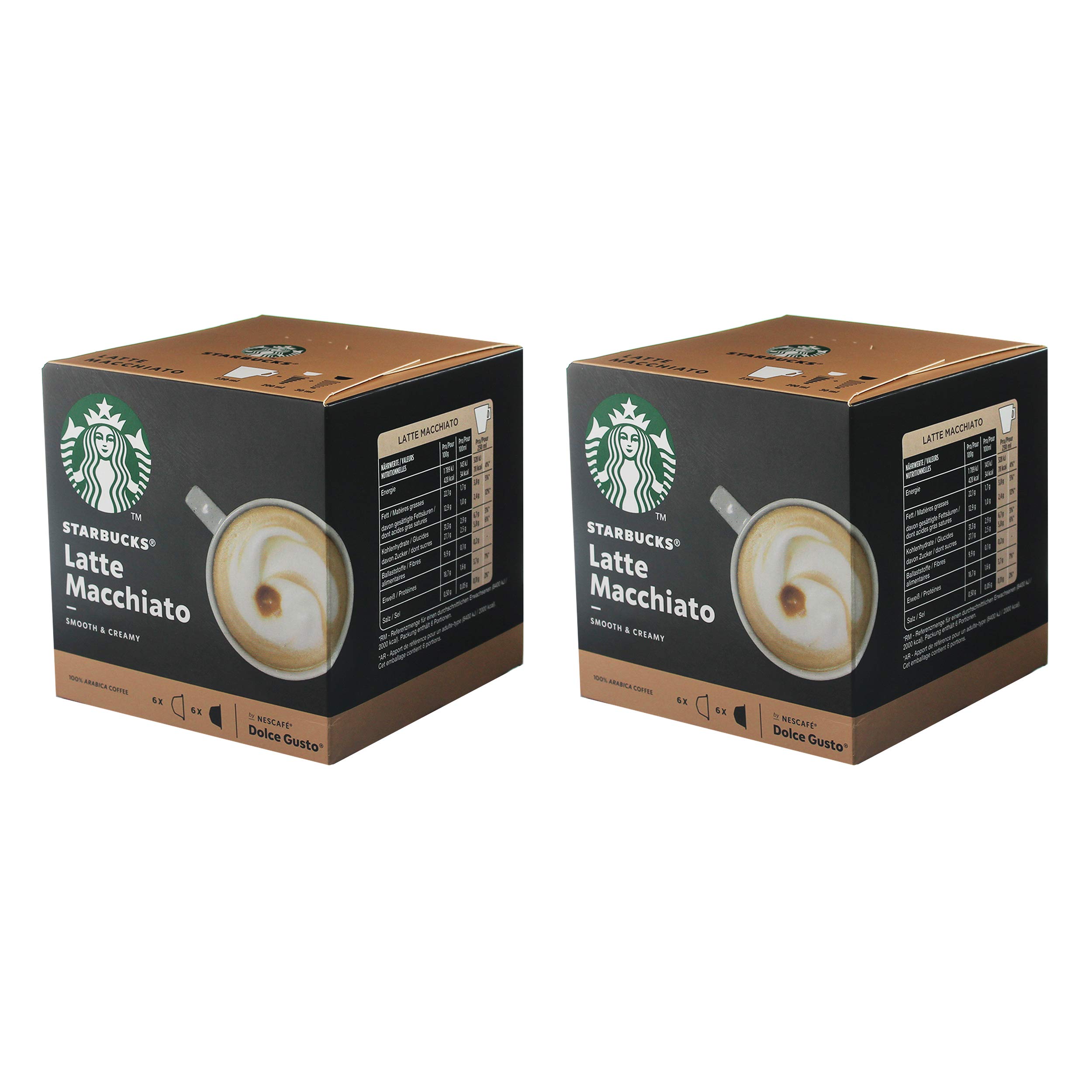 Nescafé Dolce Gusto Starbucks Latte Macchiato, coffee, latte, coffee capsules, 12 capsules: inspired by your Starbucks Latte Macchiato – smooth, full-bodied, and delicious. Now easy to prepare at home with your Nescafé Dolce Gusto machine. Each pack contains 12 capsules (6 powdered milk capsules and 6 coffee capsules) for a total of 6 servings. Manufacturer manufactured for: Nestlé Deutschland AG, Lyoner Straße 23, 60523 Frankfurt, Germany, ingredients: DG0479: coffee capsule: ground coffee: whole milk powder (90 ), sugar (10 ), emulsifier lecithin (contains soy) Delivery contents: 2 x 1 pack of Nescafé Dolce Gusto Starbucks capsules, latte macchiato, coffee, café au lait, coffee capsules, 12 capsules 6 portions.