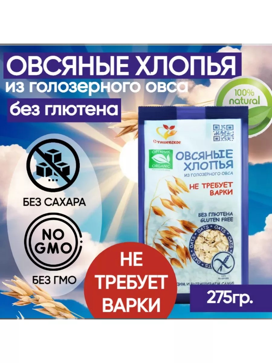 Безглютеновые овсяные хлопья Сташевское быстрого приготовления не требующие варки - очень быстрый и удобный завтрак. Завариваются в горячей воде или молоке за 1 минуту. Исключительные свойства продукту придает голозёрный овёс, содержание сырого белка в нём значительно превосходит этот показатель у плёнчатых сортов. Овсяная каша из голозёрного овса содержит в 1,5 раза больше овсяного масла и натурального витамина Е, богаты витаминами В1, В2, В6, каротином, витамином К. Высокое содержание бета-глюканов, снижает уровень холестерина в крови. Уникальный состав масел и аминокислот обеспечивает отменные вкусовые качества. Овсяные хлопья компании Сташевскоеи деально подходят для современных людей, придерживающихся здорового образа жизни и питания. Этот продукт незаменим для пациентов с выявленной глютеновой энтеропатией (целиакией), а также для людей, имеющих острые или хронические гастроэнтерологические заболевания и проблемы сердечно-сосудистой системы.ускоряет очищение лёгких и желудочно-кишечного тракта;повышает иммунитет;способствует быстрому восстановлению после умственных и физических нагрузок;обеспечивает эластичность сосудов;содержит бета-глюканы, регулирующие уровень глюкозы в крови.