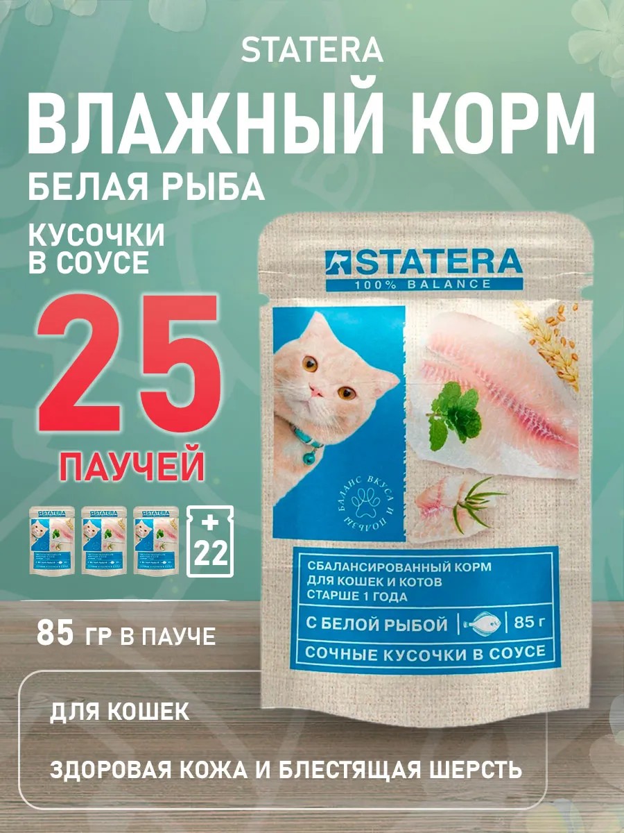 Корм Statera для кошек. Аппетитные кусочки белой рыбы в нежном соусе, приготовлены с учетом всех индивидуальных потребностей взрослых кошек и котов. Настоящее удовольствие в одной миске!