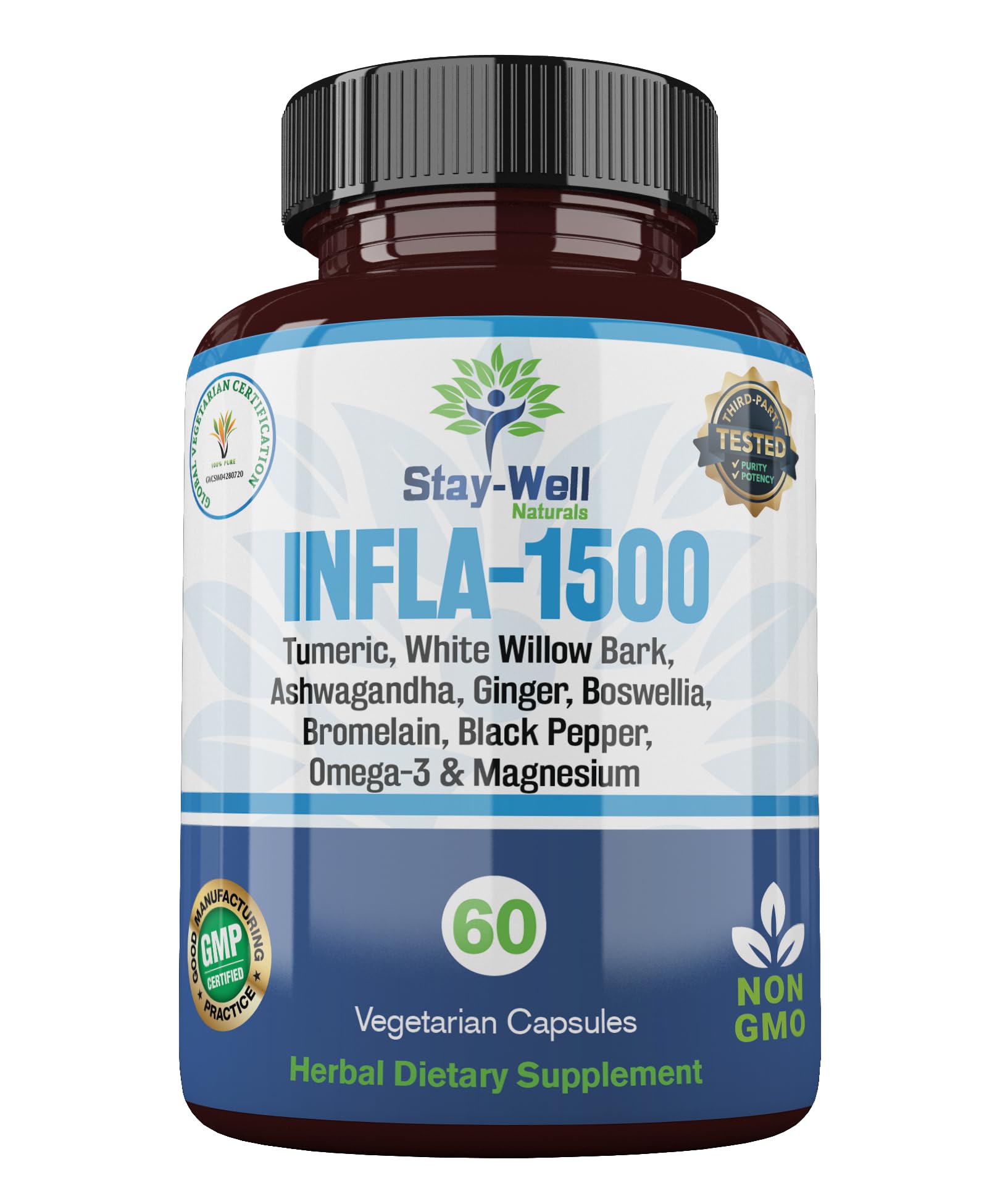 Stay-Well Naturals Infla-1500 All-Natural Relief Supplement Extract Blend with Turmeric White Willow Bark Ashwagandha Ginger Boswellia Bromelain Omega-3 and Magnesium-60ct