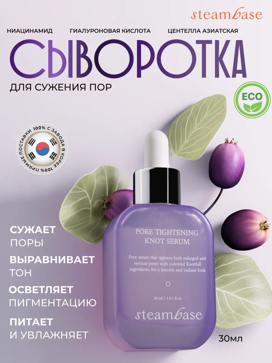 Steambase Pore Tightening Knot Serum. Сыворотка для лица с ниацинамидом, скваланом и экстрактом центеллы азитской — это себорегулирующее средство, которое эффективно сужает поры, увлажняет, питает кожу, работает против прыщей, комедонов и черных точек. Сыворотка для лица увлажняющая с гиалуроновой кислотой.