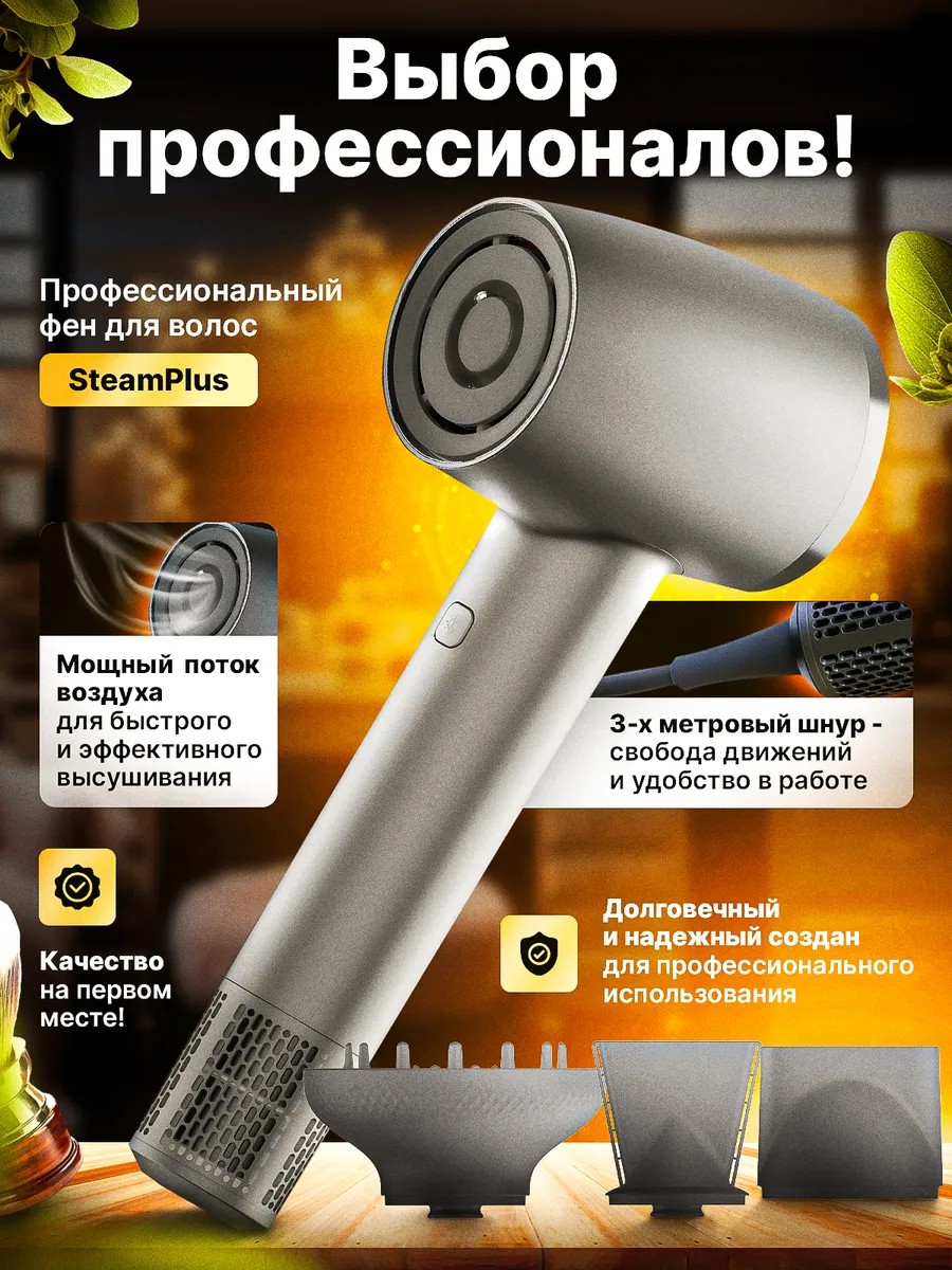 Профессиональный фен Magic hair от Steam plus — это отличный выбор для быстрой и бережной сушки волос любого типа! Девайс оснащен BLDC - мотором, обеспечивающим до 110 000 оборотов в минуту. Такая мощность позволяет высушить даже густые и длинные волосы всего за 5 минут! Вам доступно три температурных режима и 20 скоростей обдува! Мощность потока воздуха плавно регулируется колесиком! Функция ионизации с более 10 млн. отрицательных ионов помогает бороться со статическим напряжением, делая локоны более гладкими, блестящими и послушными. Шнур длиной 3 метра позволяет работать из разных точек комнаты.