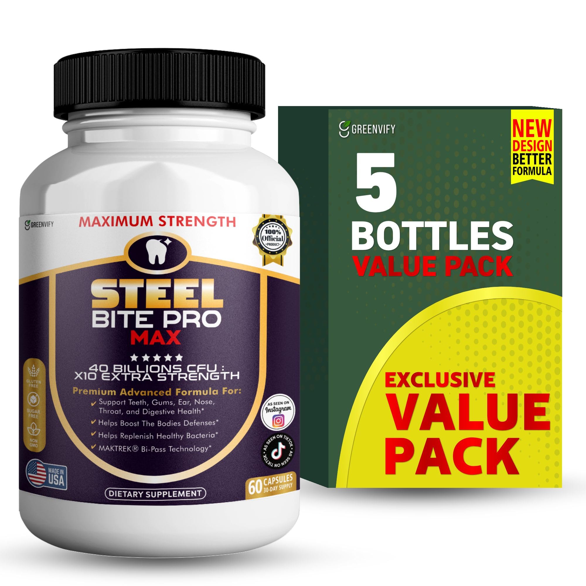 Experience total digestive and immune support with Steel Bite Pro Max Probiotic Supplement – a premium blend delivering 40 Billion CFUs from carefully selected, clinically backed probiotic strains. Designed to help maintain a balanced gut microbiome, this high-potency formula supports smoother digestion, reduced bloating, and improved nutrient absorption. It also plays a vital role in strengthening your immune response by restoring good bacteria levels. Unlike ordinary probiotics, Steel Bite Pro Max includes prebiotics, the essential fuel that probiotics need to thrive and multiply in your gut—amplifying their benefits for long-term digestive health. With 60 easy-to-swallow capsules (30-day supply), this supplement is perfect for daily wellness. Made in a GMP-certified facility, it's non-GMO, gluten-free, dairy-free, and free from harmful additives—so you can feel confident about what you're putting into your body.