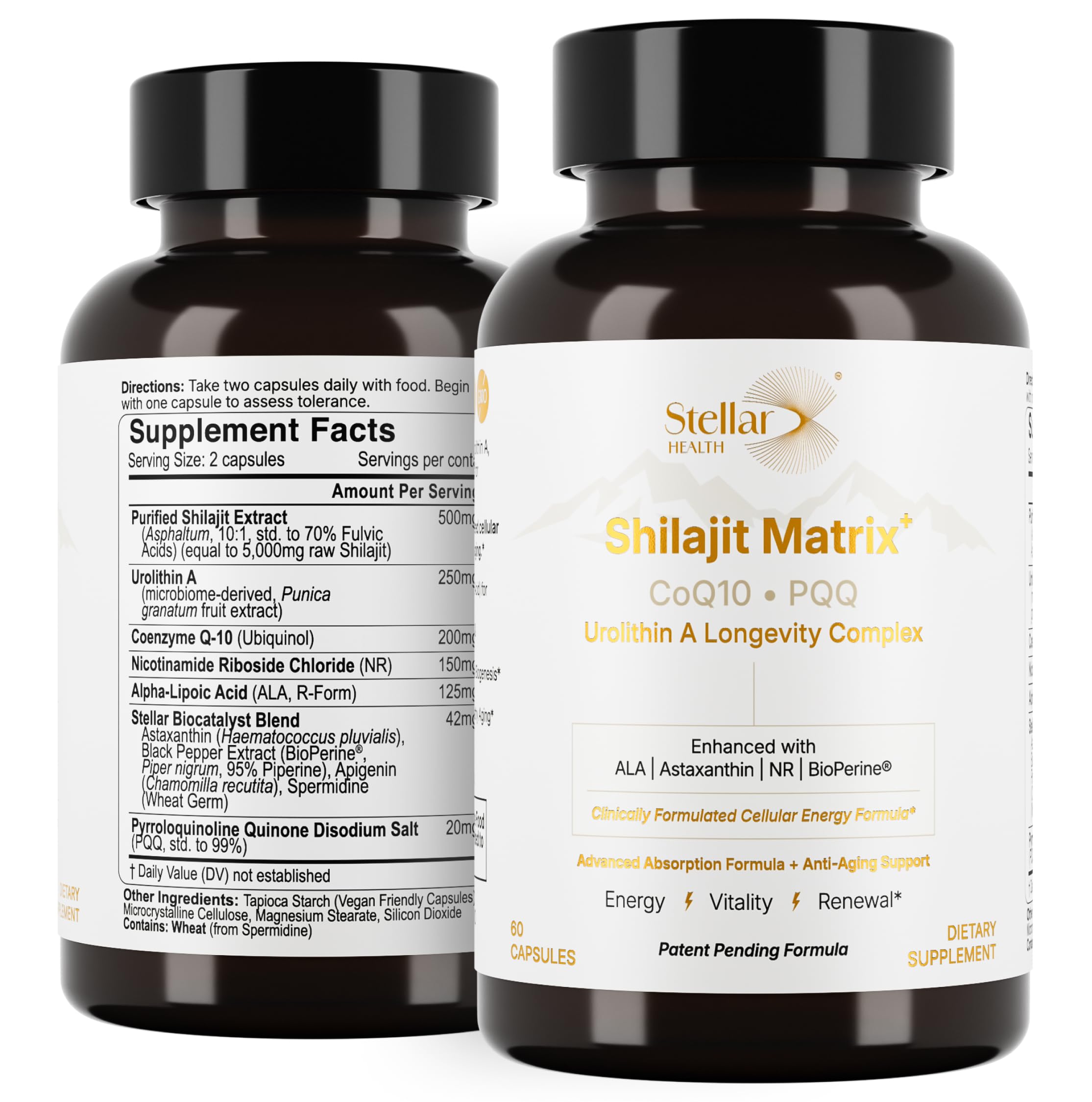 Our Ingredients: Each Ingredient is carefully sourced from qualified and standardized facilities around the world and 3rd party tested. This nad supplement includes 10:1 purified shilajit resin (high trace minerals and fulvic acid), alpha lipoic acid (r alpha lipoic acid), urolithin a (nad supplement), coenzyme q10 (coq10 ubiquinol, better absorption than ubiquinone), nicotinamide riboside chloride (nad plus), astaxanthin supplement (ultimate antioxidant), black pepper extract (gut health and nutrient booster), apigenin (nad ), spermidine (anti aging and morning recovery), PQQ. . PATENT-PENDING, CLEAN FORMULA: Our patent-pending blend is formulated from 700 studies – a true "all-in-one" mitochondrial support. Contains precise, disclosed dosages of all actives in 2 vegan capsules. Non-GMO, gluten-free, made in USA cGMP labs. Each ingredient (Shilajit, PQQ, NR, ALA, Astaxanthin, Apigenin, Spermidine, BioPerine) is clinically dosed for synergy and transparency. . SUPERIOR ABSORPTION: Our formula includes BioPerine (black pepper extract, 10mg) and healthy oil carriers to maximize uptake. Clinical studies show piperine increases CoQ10 absorption by 30 . This means more of the key nutrients reach circulation for maximum effect (vs standard CoQ10 products). . ✓ POWERED BY ASTAXANTHIN (12 mg): A highly bioactive antioxidant known for protecting cells from oxidative stress, alongside CoQ10 and R-Alpha Lipoic Acid, which help support the body's natural antioxidant systems. Shilajit's fulvic compounds assist in cellular energy processes, while Apigenin (15 mg) supports healthy cellular signaling and NAD? preservation. Spermidine (5 mg) supports the body's natural cellular renewal processes. Together, this advanced blend helps maintain cellular integrity, energy production, and overall vitality as part of a healthy lifestyle. . MITOCHONDRIAL BIOGENESIS: Contains PQQ (20mg) to activate PGC-1a and spur new mitochondria. R-ALA (125mg) CoQ10 upregulate PGC-1a and quadruple glutathione (the cell's antioxidant defense). Nicotinamide Riboside (150mg) fuels NAD? production for healthy aging and energy metabolism. . ? CLINICALLY PROVEN ENERGY: Our 2-capsule serving (200mg Ubiquinol 5000mg Shilajit) dramatically boosts cellular ATP. In trials, CoQ10 Shilajit increased muscle ATP by 144 (27 more than CoQ10 alone) and brain ATP by 56 (40 more than CoQ10 alone) – delivering sustained energy and endurance. .
