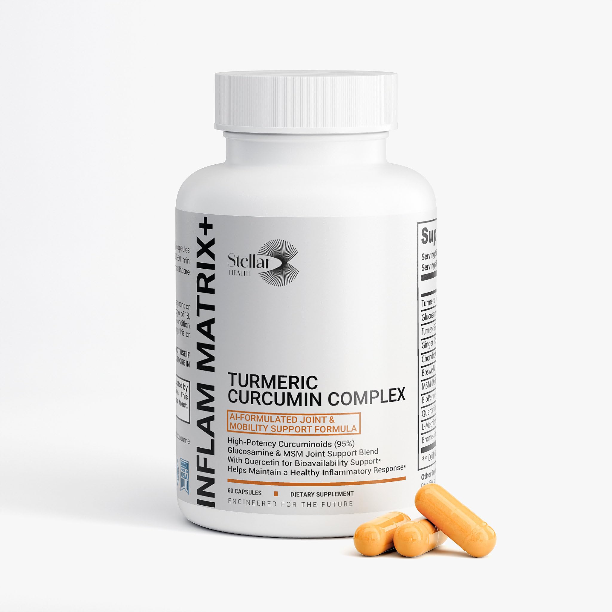 CLEAN, PROFESSIONAL-GRADE TURMERIC CAPSULES: Manufactured in a USA facility following strict Good Manufacturing Practices (GMP) for quality assurance. Our curcumin supplements are delivered in easy-to-swallow turmeric capsules with no synthetic fillers or misleading dosage claims—just clean, effective joint support supplementation designed for daily use as directed. POWERFUL TURMERIC ROOT GINGER ROOT SYNERGY: We combine premium Turmeric Root with Ginger Root to deliver a potent anti-inflammatory support blend. This time-tested turmeric curcumin with black pepper combination has been used for centuries to support healthy inflammatory response, while Boswellia Extract and Bromelain provide additional comfort support for active individuals. . COMPLETE MULTI-COMPONENT JOINT SUPPORT MATRIX: This isn't just turmeric—it's a comprehensive turmeric and ginger supplement featuring Glucosamine Sulfate, Chondroitin Sulfate, MSM, Boswellia Extract, Ginger Root, Quercetin Dihydrate, Bromelain, and L-Methionine in balanced, clinically relevant amounts. Each ingredient targets different aspects of joint health for complete mobility nutrition. . ? STANDARDIZED CURCUMINOIDS WITH BIOPERINE FOR ABSORPTION: Our turmeric curcumin supplement features turmeric powder with 95 curcuminoids for consistent, high-potency botanical content per serving. Enhanced with Piperine (BioPerine), this turmeric with black pepper formula increases curcumin bioavailability by up to 2000 , ensuring your body absorbs and utilizes these powerful curcuminoids effectively. . ADVANCED TURMERIC CURCUMIN FOR JOINT SUPPORT: Inflam Matrix is a clinically inspired turmeric supplement and joint support formula designed to help support daily joint comfort and mobility as part of a healthy lifestyle. This comprehensive joint supplements for men and women combines the power of turmeric root with synergistic ingredients for anti-inflammatory support and long-term joint health. .