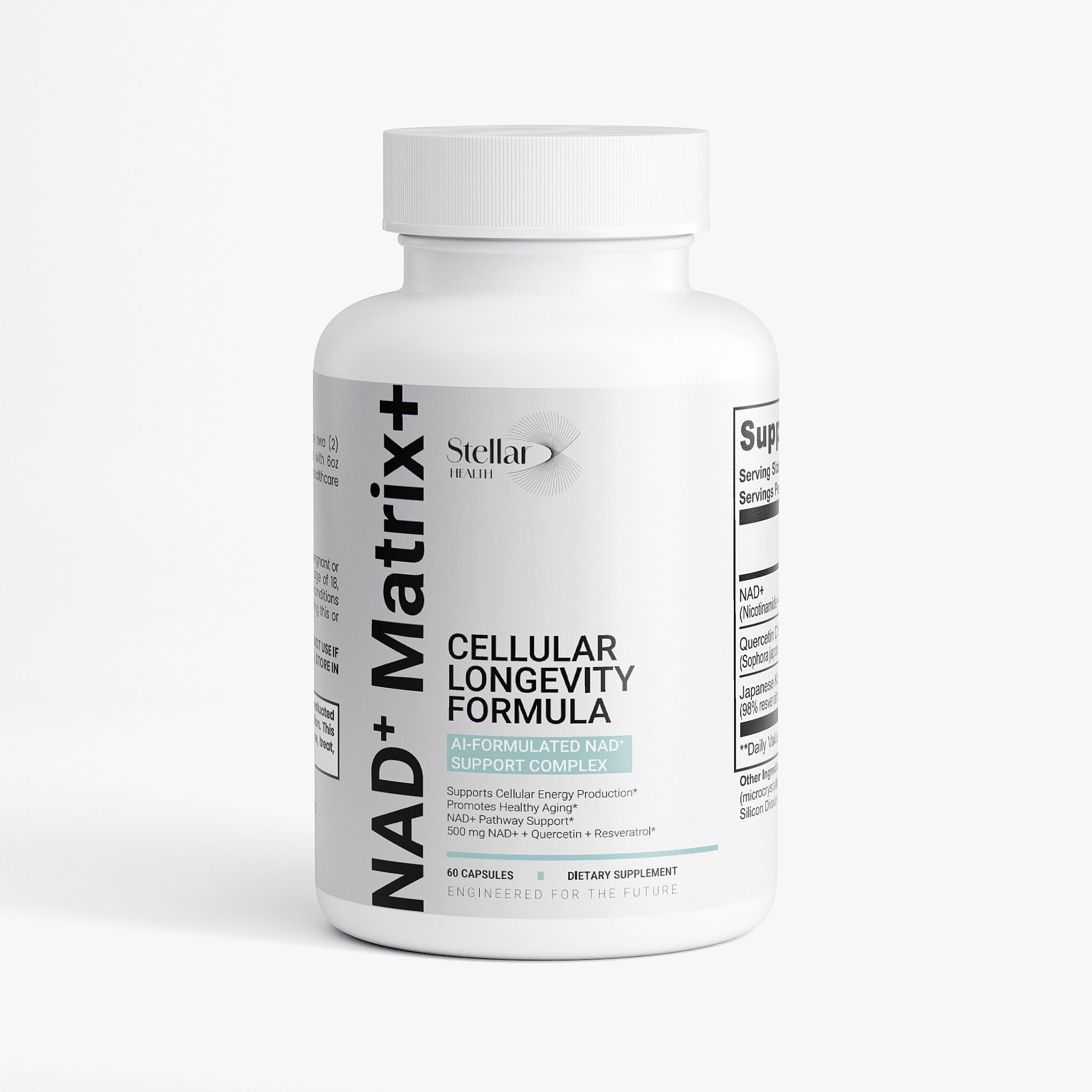 PROFESSIONAL-GRADE NAD SUPPLEMENT QUALITY STANDARDS: Manufactured in the USA, NAD Matrix follows strict quality protocols similar to premium brands to ensure ingredient potency. This NADH supplement alternative provides comprehensive NAD support. For optimal metabolic results, take two (2) capsules once daily, approximately 20-30 minutes before a meal with 8oz of water. . CLEAN LABEL NAD SUPPLEMENTS PURE INGREDIENTS: Stellar Health prioritizes biological purity in our NADS formula it's Gluten-Free, Lactose-Free, and Hormone-Free. Each dose of this premium NAD Supplement is delivered in a non-GMO hypromellose (HPMC) vegetable capsule with no synthetic dyes or harsh fillers—cleaner than many Niagen alternatives on the market. . ? ADVANCED NAD SUPPLEMENT BIO-OPTIMIZED ABSORPTION: Engineered for the future, our NAD Plus supplement includes 150mg of Japanese Knotweed Extract standardized to 98 Resveratrol to act as a sirtuin activator, working in harmony with NAD . We include Olive Oil in our formula to support the bioavailability of these fat-soluble longevity compounds—similar absorption technology used in premium Liposomal NAD and NAD Advanced formulas. . SYNERGISTIC LONGEVITY TRIAD WITH NMN RESVERATROL: Our NAD supplements for men and women utilizes a high-performance stack combining NAD , Quercetin, and Resveratrol to support healthy aging pathways. By combining 500mg of NAD with 250mg of Quercetin Dihydrate and 150mg of Japanese Knotweed Extract (98 Resveratrol), we target the biological markers of cellular senescence and oxidative stress for comprehensive longevity support. . PEAK CELLULAR ENERGY WITH 500MG NAD SUPPLEMENT: NAD Matrix is an AI-formulated NAD supplement designed to replenish essential Nicotinamide Adenine Dinucleotide (NAD ) levels. Each serving delivers a potent 500mg of NAD Plus to drive mitochondrial ATP production, effectively fueling your body's cellular "power plants" for sustained vitality. This advanced NAD supplement supports the same cellular pathways as NAD Nicotinamide Riboside formulas. .
