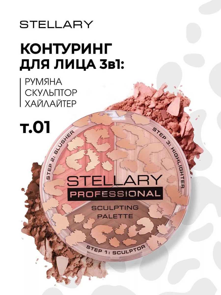 Stellary Face Sculptor Contouring, shade 01. Accentuate cheekbones, add radiance, and refresh your look with just one palette. This 3-in-1 set provides expressive makeup you'll want to repeat every day. The dry blush gives your face a rested look, the sculptor adds structure, and the dry highlighter helps highlight desired areas and imparts a delicate shimmer.
