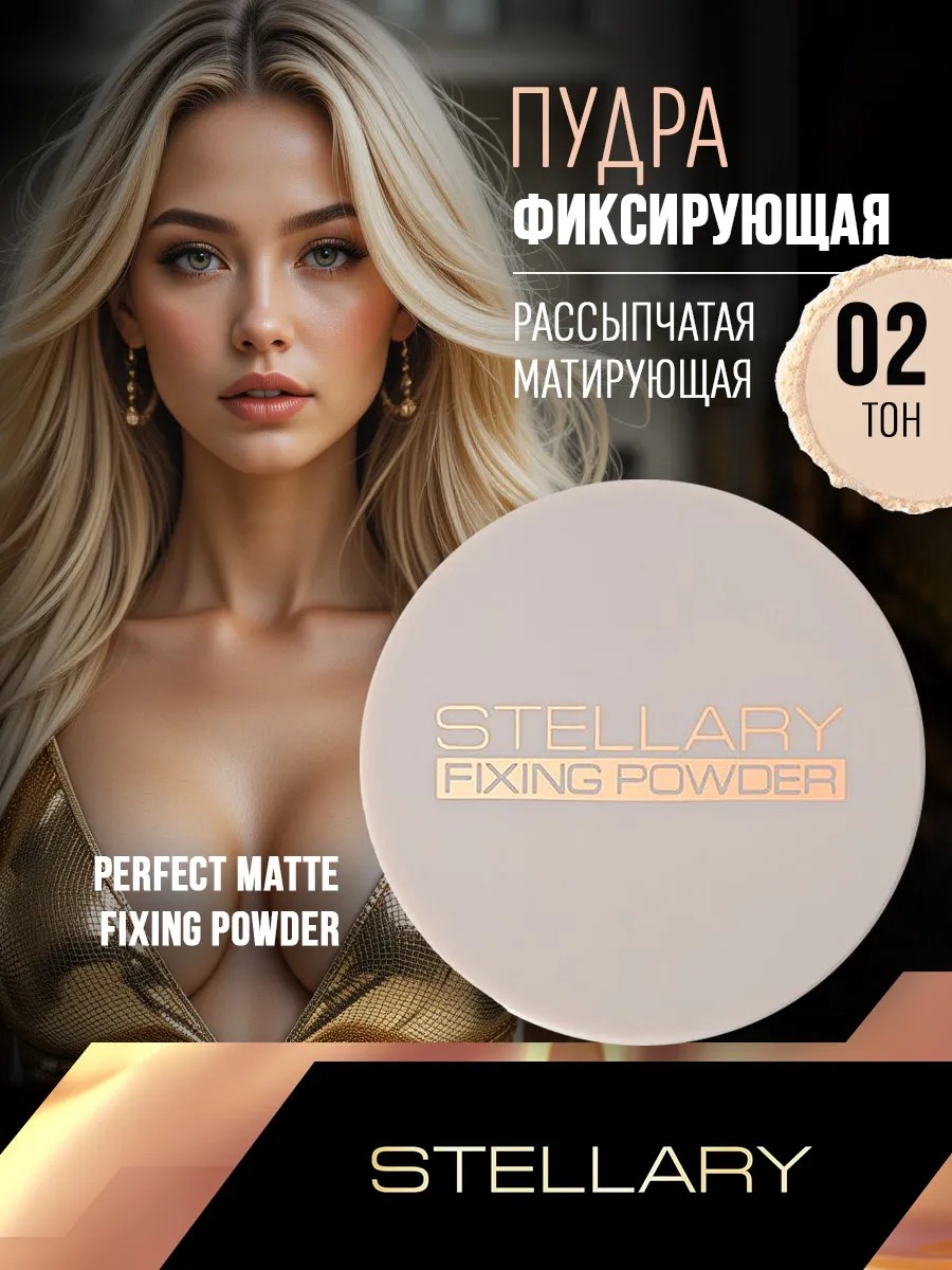 Stellary Пудра рассыпчатая фиксирующая Transparent.Рассыпчатая матирующая пудра PERFECT MATTE FIXING POWDER от STELLARY фиксирует макияж и продлевает его стойкость, блюрит кожу, не меняя ее цвет, и скрывает несовершенства. Рассыпчатая пудра обеспечивает стойкий макияж и ровный матовый тон в течение всего дня. Благодаря легкой нежной текстуре она ложится на кожу невесомой вуалью, идеально матируя и фиксируя макияж. Мелкодисперсная рассыпчатая пудра на основе силиконов разглаживает и скрывает поры, выравнивает тон кожи. Продукт легко распределяется, создавая невесомое шелковистое покрытие, сохраняя кожу мягкой и гладкой. Фиксирующая пудра представлена в прозрачном и банановом оттенках, которые подходят для кожи с любым подтоном. Упаковка пудры в обновленном дизайне бежевого цвета выполнена из прочного пластика. Круглую крышку украшает золотой логотип, который добавляет продукту лоска.СПОСОБ ПРИМЕНЕНИЯ:Используйте для фиксации макияжа поверх тонального средства с помощью пуховки или кисти для пудры.