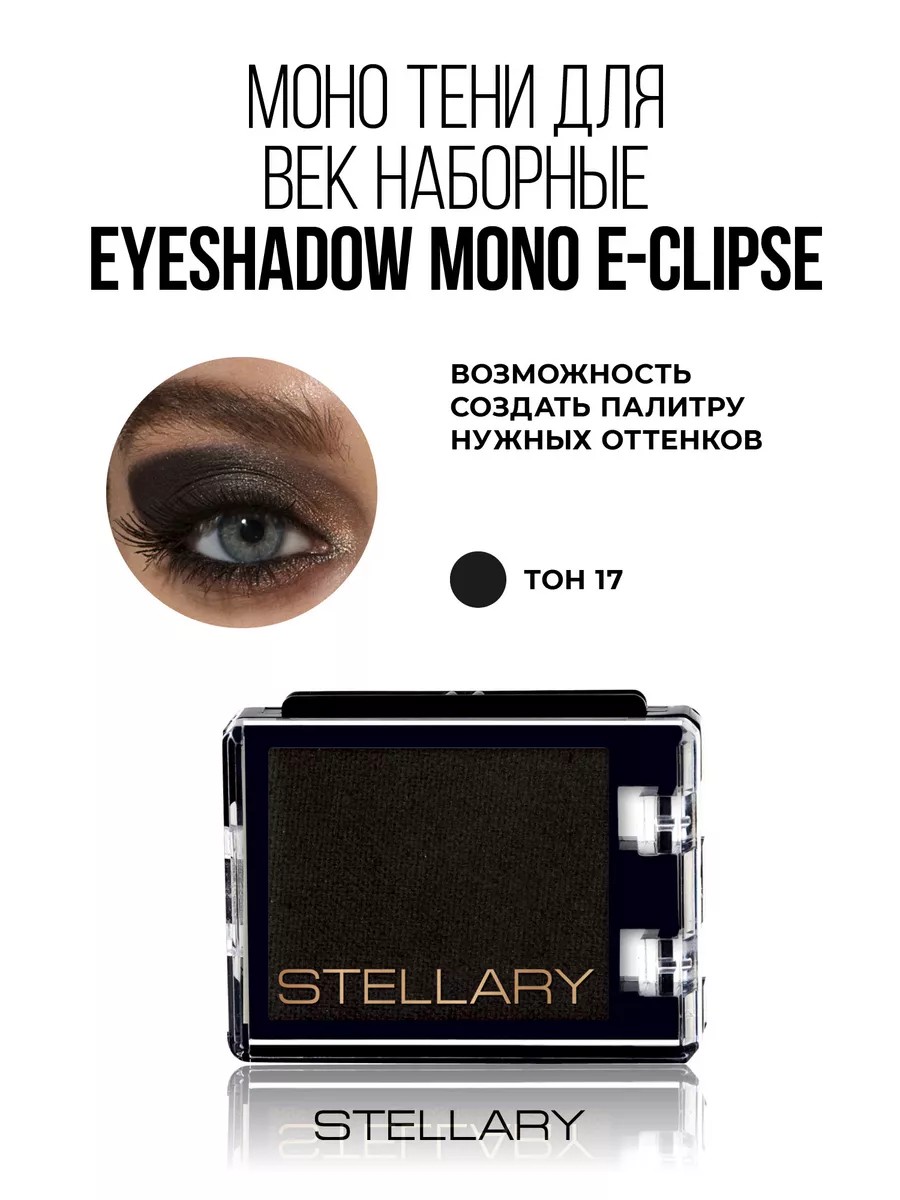 E-Clipse mono eyeshadows are perfect for creating striking looks and experimenting with makeup. Shade 17 is black velvet. The soft texture applies evenly and provides rich color payoff. Each palette contains both shimmer and matte shades, and the mono eyeshadow cases easily connect, allowing you to create your own set with shades that complement your complexion. Emollients in the formula create a silky texture, mica adds radiance, and talc ensures pigment retention. The palette features shades with a satin finish (20), universal matte shades (03, 17, 24), and expressive shimmers for a radiant, glamorous look (08, 18, 23, 30). HOW TO USE: Apply the shadows to the eyes or eyebrows with the applicator or professional brushes STELLARY PRO #207, #208, #210, #212. Dry application provides a natural effect and a beautiful result, while wet application allows for a brighter, more radiant, and saturated color. To prolong the long-lasting makeup, use the STELLARY 01 eyeshadow base. Women's decorative cosmetics will perfectly highlight your beauty and help you create both bright and nude looks.