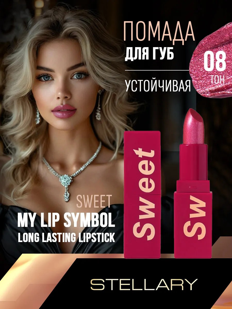 This long-lasting lipstick feels comfortable on the lips, applies evenly, and imparts rich color thanks to its high pigmentation. Each shade of MY LIP SYMBOL lipstick has a unique name: change colors and create looks to suit your mood. RESULT: Long-lasting lip makeup in rich tones. Product Features: This lipstick has a long-lasting, highly pigmented formula and a soft, delicate, creamy texture. Castor oil nourishes, softens, and smoothes the lips. The luxurious scarlet case with a soft-touch matte finish and gold lettering will reflect your character and status. The lipstick texture has a pleasant scent of juicy grapes. WHO IT'S FOR: Those who love long-lasting, comfortable lipsticks in rich shades and who prefer to change their makeup looks and styles. MAKEUP ARTIST'S RECOMMENDATIONS: For full coverage and a rich shade, apply lipstick from a stick. For light, translucent coverage, gently apply lipstick with your fingertips using patting movements. Before applying lipstick, outline the lip contour with a LIPLINER or AUTOMATIC LIPLINER pencil from STELLARY. Ingredients: RICINUS COMMUNIS (CASTOR) SEED OIL; Octyldodecanol, Cera Microcristallina (Microcrystalline Wax); Ethylhexyl Palmitate, Paraffin, Isononyl Isononanoate; BIS-DIGLYCERYL POLYACYLADIPATE-2, CAPRYLIC/CAPRIC TRIGLYCERIDE; Synthetic Fluorphlogopite, Parfum; COPERNICIA CERIFERA CERA [COPERNICA CERIFERA (CARNAUBA) WAX]; SILICA DIMETHYL SILYLATE, METHYLPARABEN, PROPYLPARABEN; MONTAN ACID WAX, BHT; Hydrogenated Styrene/Methyl Styrene/Indene Copolymer; SHEREA ROBUSTA RESIN, GERANIOL; BENZYL BENZOATE, MICA, TIN OXIDE; CI 77891 (TITANIUM DIOXIDE), CI 77491 (IRON OXIDES); CI 77492 (IRON OXIDES), CI 77007, CI 75470, CI 45380.