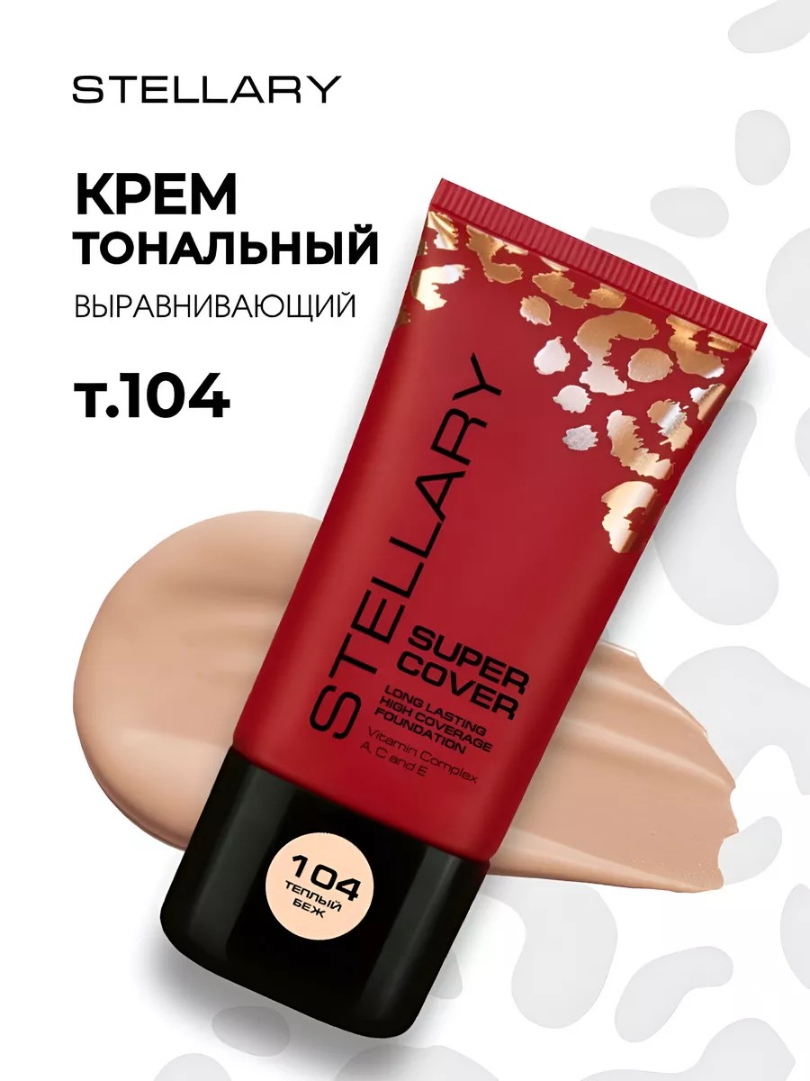 Stellary Тональный крем светлый выравнивающий Super Cover Foundation, тон 104 теплый беж. Выравнивающий тональный крем для лица матовый Super cover foundation для совершенной гладкой кожи. Тональный крем для лица Стелари корректирует и маскирует покраснения, идеально скрывает поры. С ним ваша кожа безупречно ровная и гладкая на целый день без эффекта маски. У тонального крема средняя степень покрытия. Формула с витаминами А, Е, С, комплексом полимеров и пигментов, эмолентов и экстракта коры африканского дерева усиливает стойкость, выравнивает рельеф кожи и матирует ее, сужает поры. Тональный крем для лица матирующий подходит для нормальной, жирной и комбинированной кожи. Формула обогащена витаминами А, Е и С, которые оказывают антиоксидантное действие. Комплекс пигментов обеспечивает равномерное распределение средства и стойкий макияж. Экстракт коры африканского дерева в составе крема сужает поры, матируя кожу и придавая ей свежий и здоровый вид.
