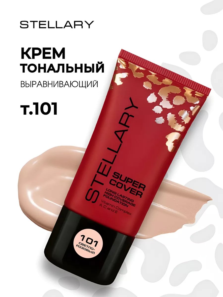 Stellary Тональный крем выравнивающий Super Cover Foundation, тон 101 светло-розовый. Выравнивающий тональный крем для лица матовый Super cover foundation для совершенной гладкой кожи. Тональный крем для лица матовый светлый корректирует и маскирует покраснения, идеально скрывает поры. С ним ваша кожа безупречно ровная и гладкая на целый день без эффекта маски. Формула с витаминами А, Е, С, комплексом полимеров и пигментов, эмолентов и экстракта коры африканского дерева усиливает стойкость, выравнивает рельеф кожи и матирует ее, сужает поры. Тональный крем для лица матирующий подходит для нормальной, жирной и комбинированной кожи. Формула обогащена витаминами А, Е и С, которые оказывают антиоксидантное действие. Комплекс пигментов обеспечивает равномерное распределение средства и стойкий макияж. Экстракт коры африканского дерева в составе крема сужает поры, матируя кожу и придавая ей свежий и здоровый вид. Способ применения: Наносите тональник кистью для тональной основы STELLARY PRO №138, спонжем или подушечками пальцев.