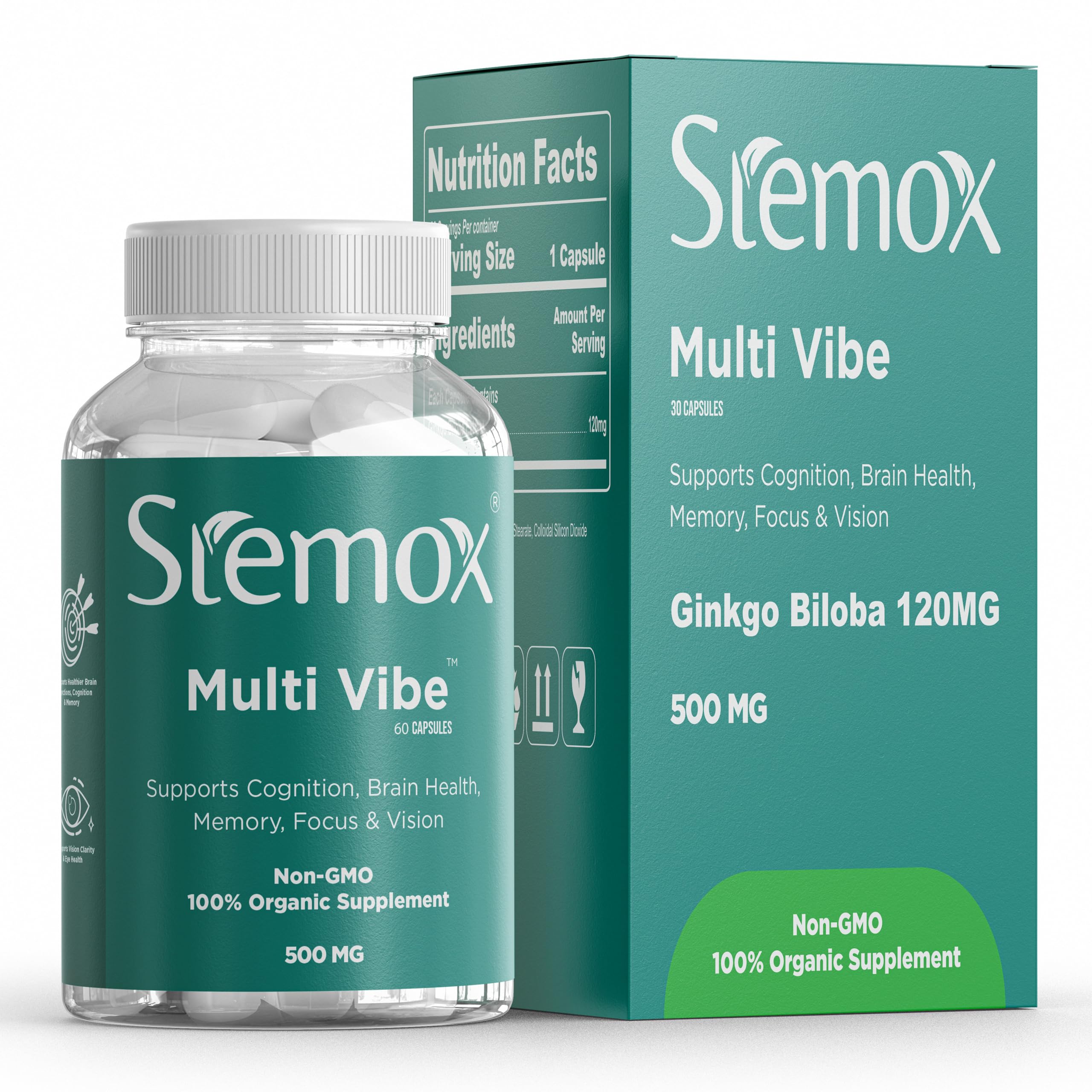 Stemox Multi Vibe Brain Supplement with Ginkgo Biloba 120mg Ginkgo Biloba Capsules Memory Supplements B Vitamins Focus Support Cognitive Health 60 Capsules