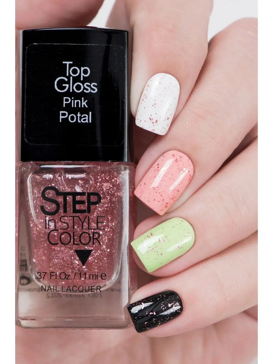 Лак для ногтей "Step In Style" Top Gloss Effect - глянцевое верхнее покрытие с поталью. На фотографии топ нанесен на цветную подложку, но можно исользовать как самостоятельное покрытие.
