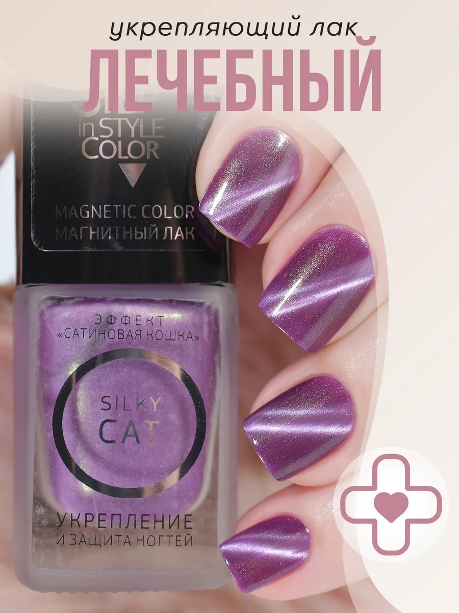 Лечебный лак для ногтей «Step in Style» Nail Highlighter Silky Cat №70 - пыльный фиолетовый оттенок с дуохромным золотисто-зеленым отливом, легко наносится и отлично смотрится на ногтях любой длины и формы. Его текстура обеспечивает равномерное покрытие и быстро высыхает на воздухе как обычный лак – без лампы. Вы легко сможете привести руки в порядок в домашних условиях, не тратя время на походы в салон. Лечебное покрытие «Step in Style» с цветом обеспечивает надежную защиту, постепенное укрепление и бережное восстановление, а также стимулирует естественный процесс роста ногтя. Формула содержит укрепляющие компоненты с доказанной эффективностью, которые уплотняют хрупкую, поврежденную ногтевую пластину и возвращают ей гибкость и здоровый блеск. Для комплексного ухода и восстановления используйте продукт курсом, регулярно нанося его на протяжении месяца.