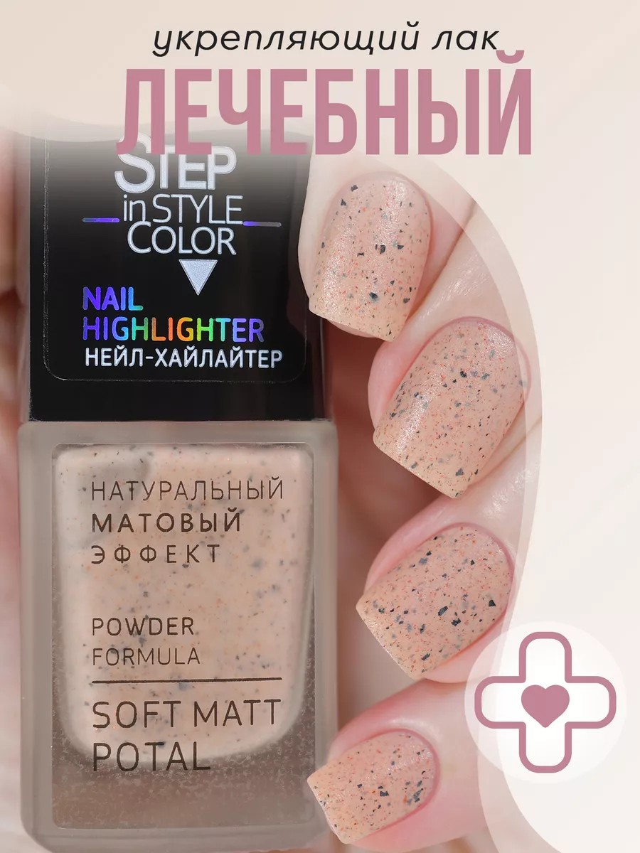 Лечебный лак для ногтей «Step in Style» Nail Highlighter 61 - теплый бежевый оттенок с черной поталью и красным шиммером, легко наносится и отлично смотрится на ногтях любой длины и формы. Его текстура обеспечивает равномерное покрытие и быстро высыхает на воздухе как обычный лак – без лампы. Вы легко сможете привести руки в порядок в домашних условиях, не тратя время на походы в салон. Лечебное покрытие «Step in Style» с цветом обеспечивает надежную защиту, постепенное укрепление и бережное восстановление, а также стимулирует естественный процесс роста ногтя. Формула содержит укрепляющие компоненты с доказанной эффективностью, которые уплотняют хрупкую, поврежденную ногтевую пластину и возвращают ей гибкость и здоровый блеск. Для комплексного ухода и восстановления используйте продукт курсом, регулярно нанося его на протяжении месяца.