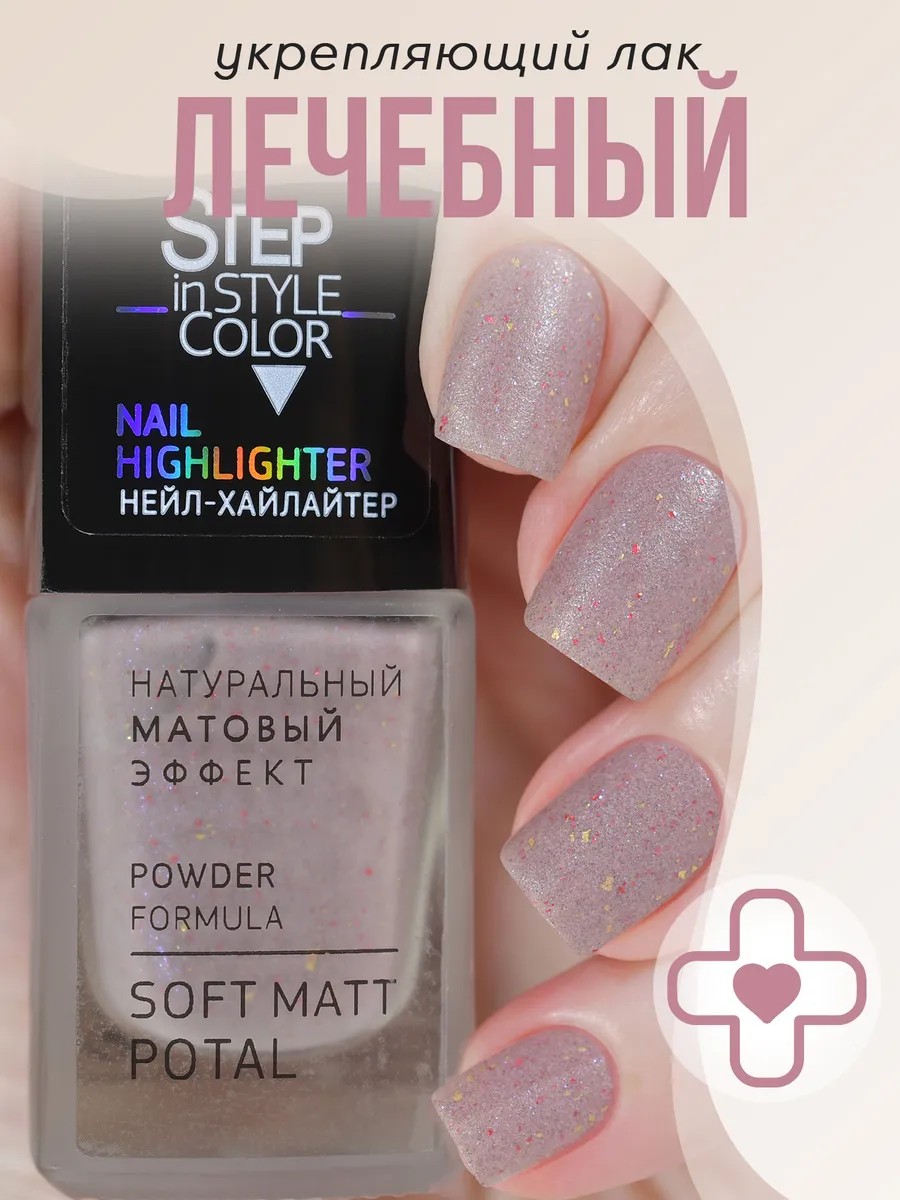 Лечебный лак для ногтей «Step in Style» Nail Highlighter 63 - теплый серый с красной и золотой поталью и сиренево-голубым шиммером, легко наносится и отлично смотрится на ногтях любой длины и формы. Его текстура обеспечивает равномерное покрытие и быстро высыхает на воздухе как обычный лак – без лампы. Вы легко сможете привести руки в порядок в домашних условиях, не тратя время на походы в салон. Лечебное покрытие «Step in Style» с цветом обеспечивает надежную защиту, постепенное укрепление и бережное восстановление, а также стимулирует естественный процесс роста ногтя. Формула содержит укрепляющие компоненты с доказанной эффективностью, которые уплотняют хрупкую, поврежденную ногтевую пластину и возвращают ей гибкость и здоровый блеск. Для комплексного ухода и восстановления используйте продукт курсом, регулярно нанося его на протяжении месяца.