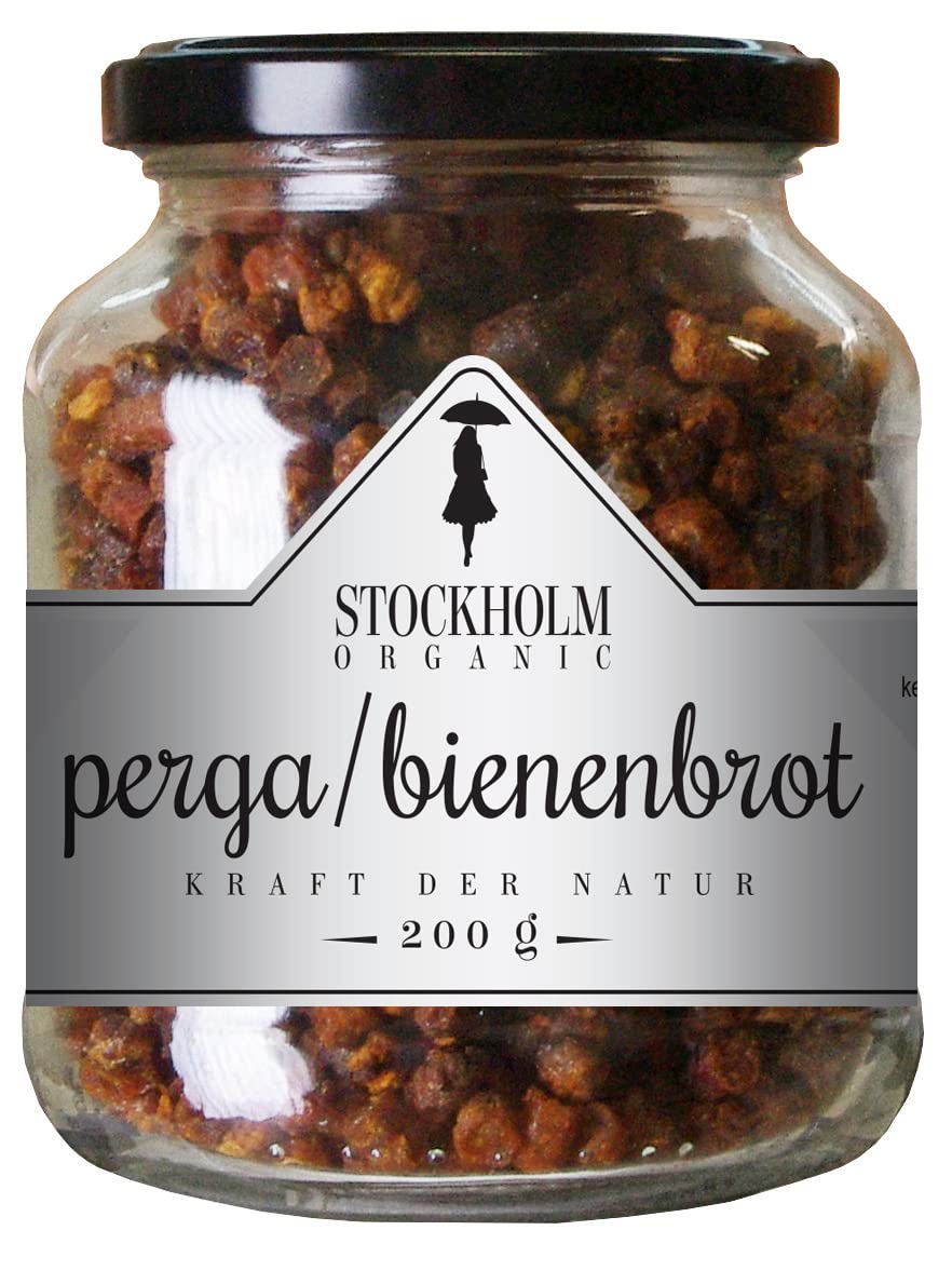 Bee bread is a fermented, enzymatically activated food made by bees in the beehive and contains about 25 honey or nectar and 70 pollen.The bioavailability of proteins, which is far superior to flower pollen, is significantly improved.Bee bread has a wide variety of minerals and has high amounts of iron, cobalt, phosphorus, calcium.It is one of the richest natural foods that contain selenium.Bee bread is also an excellent source for potassium and vitamins in the B group.Amino acids, which are pre -resumed for a slight absorption in the ratio that the human body needs, accounts for about 15 of the dry substance in the bee bread.Collected in Estonia from beehives that stand on the meadows near small forests and far from large cities, without industry or factories nearby.Produced according to high ecological standards, our bee bread is unpassed, 100 pure and natural, free of antibiotics and pesticides.Free of gluten, corn, wheat, soy and milk and GVO ingredients.With dry, cooler and dark storage, the granulate remains fresh for 2.5 years.Please note that color, taste and texture can vary depending on the harvest season.Bee bread has a wide variety of minerals and has high amounts of iron, cobalt, phosphorus, calcium.It is one of the richest natural foods that contain selenium.Bee bread is also an excellent source for potassium and vitamins in the B group.Increase your energy - take 1 or more teaspoons a day, preferably in the morning.100 natural, without additives.Bienenbrot ist ein fermentiertes, enzymatisch aktiviertes Lebensmittel, das von Bienen im Bienenstock hergestellt wird und etwa 25 Honig oder Nektar und 70 Pollen enthält. Die Bioverfügbarkeit von Proteinen, die Blütenpollen weit überlegen ist, wird erheblich verbessert. Bienenbrot hat eine große Vielfalt an Mineralien und hat hohe Mengen an Eisen, Kobalt, Phosphor, Kalzium. Es ist eines der reichsten natürlichen Lebensmittel, die Selen enthalten. Bienenbrot ist auch eine ausgezeichnete Quelle für Kalium und Vitamine der B-Gruppe. Aminosäuren, die für eine leichte Aufnahme in dem Verhältnis vorverdaut sind, das der menschliche Körper benötigt, machen etwa 15 der Trockensubstanz im Bienenbrot aus. Gesammelt in Estland aus Bienenstöcken, die auf den Wiesen in der Nähe kleiner Wälder und weit entfernt von Großstädten stehen, ohne Industrie oder Fabriken in der Nähe. Nach hohen ökologischen Standards produziert, ist unser Bienenbrot unverarbeitet, 100 rein und natürlich, frei von Antibiotika und Pestiziden. Frei von Gluten, Mais, Weizen, Soja und Milch- und GVO-Zutaten. Bei trockener, kühler und dunkler Lagerung bleibt das Granulat 2,5 Jahre frisch.Bitte beachten Sie, dass Farbe, Geschmack und Textur je nach Erntesaison variieren können. Bienenbrot hat eine große Vielfalt an Mineralien und hat hohe Mengen an Eisen, Kobalt, Phosphor, Kalzium. Es ist eines der reichsten natürlichen Lebensmittel, die Selen enthalten. Bienenbrot ist auch eine ausgezeichnete Quelle für Kalium und Vitamine der B-Gruppe. Steigern Sie Ihre Energie - nehmen Sie 1 oder mehr Teelöffel pro Tag ein, vorzugsweise morgens. 100 natürlich, ohne Zusatzstoffe.Stockholm Organic Perga - Bienenbrot 200g