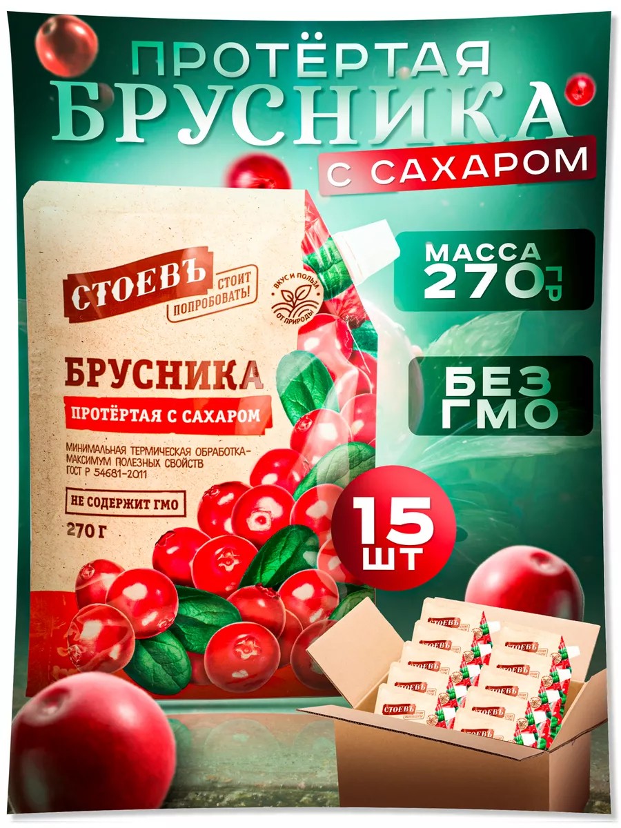 | Комплектация | протертая ягода 15 шт.; протертая ягода с сахаром 15 шт.; протертая ягода 15 шт. по 270 гр; протертая брусника 15 шт. |