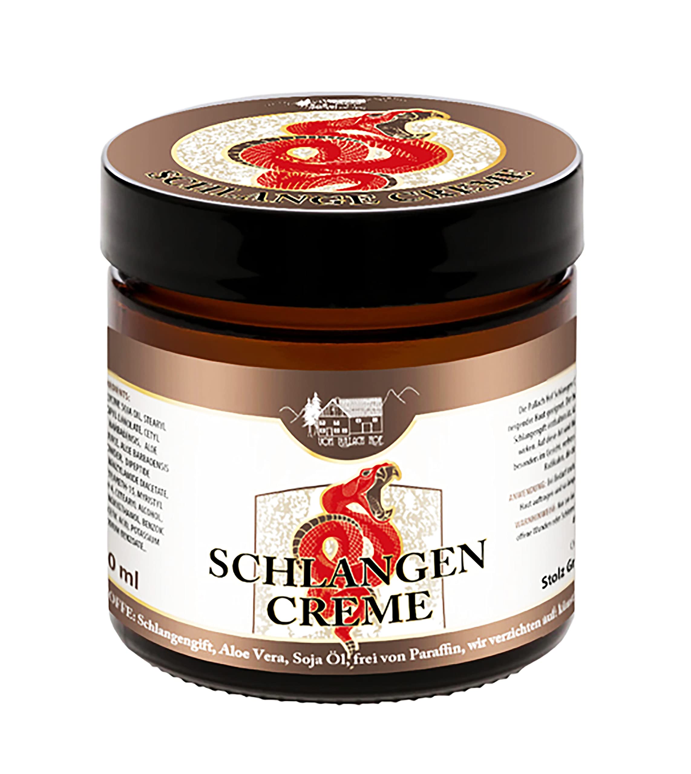 SNAKE CREAM 100ml Anti-aging. from Pullach Hof Box 100 ml. For age-related skin prone to wrinkles. Protects against free radicals In brown glass jar with black closure. Shelf life: 6 months after opening Made in Germany. The Pullach Hof Slangen cream is particularly suitable for the care of skin that tends to wrinkle due to age. The special active substance and body protein building blocks contained in the snake venom can counteract the mechanical skin aging process. In this way, wrinkles can be smoothed and the appearance of the skin - especially on the face - can be improved. In addition, the snake venom protects against free radicals that can promote the skin aging process. Important ingredients such as snake venom, aloe vera and soy oil. Free from paraffin. No artificial colors or fragrances. Usage: If necessary, apply to cleansed skin several times a day, morning and evening, and massage until the cream is completely absorbed. Notes: For external use only. Not suitable for children. Do not apply to open wounds or mucous membranes. Do not use this item if you are allergic to any of the ingredients. Ingredients: aqua, glycerin, glycine soybean oil, stearyl alcohol, isopropyl lanolate, cetyl alcohol, aloe barbadensis leaf juice, aloe barbadensis leaf juice, dipeptide diaminobutyroyl benzylamide diacetate, ceteareth-25, ceteareth-15, myristyl alcohol, Reth-4, C: etearyl alcohol, tocopherol, phenoxyethanol, benzoic acid, dehydroacetic acid, potassium chloride, sodium benzoate.Shelf life: 6 months after opening. In brown glass jar with black closure. Protects against free radicals. For age-related skin prone to wrinkles. Pullach Hof SLANGE CREAM 100 ml.SLANGEN CREAM 100ml slangencrème anti-aging rimpels huidverzorging huid balsem zalf 02 SLANGE CREAM 100ml Anti-aging. van Pullach Hof Doos 100 ml. Voor leeftijdsgerelateerde naar rimpels neigende huid. Beschermt tegen vrije radicalen In bruin glas pot met zwarte sluiting. Houdbaarheid: 6 maanden na opening Gemaakt in Duitsland. De Pullach Hof Slangen crème is bijzonder geschikt voor de verzorging van de huid die door leeftijd naar rimpels neigt. De bijzondere werkzame stof en lichaamseiwitbouwstenen die in het slangengif zitten, kunnen het mechanische huidverouderingsproces tegengaan. Zo kunnen rimpels gladgestreken worden en het uiterlijk van de huid - vooral op het gezicht - worden verbeterd. Bovendien beschermt het slangengif tegen vrije radicalen die het huidverouderingsproces kunnen bevorderen. Belangrijke ingrediënten zoals slangengif, aloë vera en sojaolie. Vrij van paraffine. Geen kunstmatige kleur- en geurstoffen. Gebruik: Indien nodig ook meerdere keren per dag, maar 's ochtends en 's avonds op de gereinigde huid aanbrengen en zo lang inmasseren tot de crème volledig is opgenomen. Opmerkingen: Alleen voor uitwendig gebruik. Niet geschikt voor kinderen. Niet aanbrengen op open wonden of slijmvliezen. Gebruik dit artikel niet bij allergie voor een van de ingrediënten. Ingrediënten: aqua, glycerine, glycine sojaolie, stearyl alcohol, isopropyl lanolate, cetyl alcohol, aloë barbadensis bladsap, aloë barbadensis bladsap, dipeptide diaminobutyroyl benzylamide diacetaat, ceteareth-25, ceteareth-15, myristyl alcohol, Reth-4, C: etearyl alcohol, tocoferol, fenoxyethanol, benzoïsche zuur, dehydroacetisch zuur, potassium srobaat, natriumbenzoaat.Houdbaarheid: 6 maanden na opening. In bruin glas pot met zwarte sluiting. Beschermt tegen vrije radicalen. Voor leeftijdsgerelateerde naar rimpels neigende huid. Pullach Hof SLANGE CREAM 100 ml.