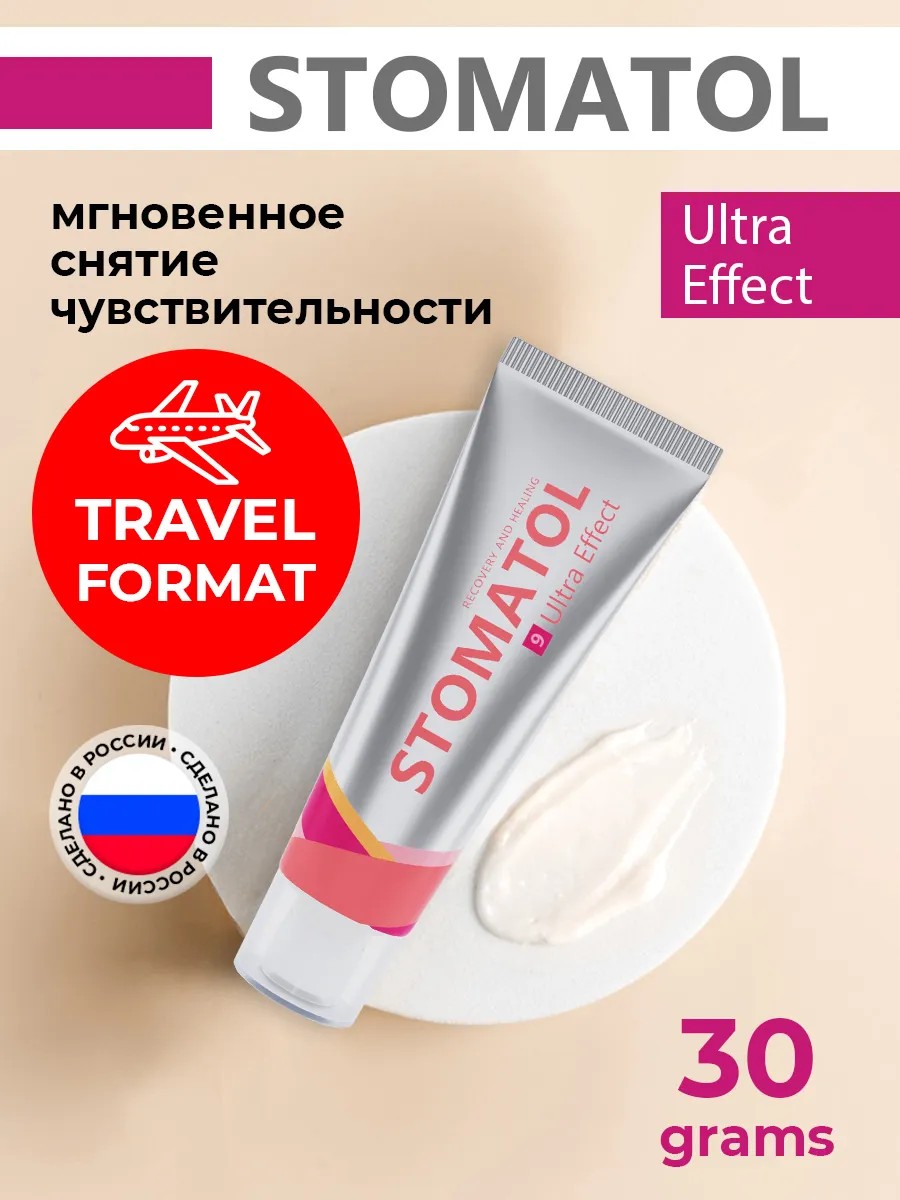Зубная паста Stomatol Ultra Effect (30 гр, тревел формат, дорожный формат, зубная паста мини формат в дорогу) – быстрое решение для чувствительных зубов. Ее уникальный состав с двумя запатентованными комплексами обеспечивает мгновенное снижение дискомфорта и создает защитный слой на поверхности дентина. Паста действует уже во время чистки зубов и подходит даже для сверхчувствительной эмали. Основные компоненты: Ионы калия и кальция из гидроксиапатита и солей калия проникают внутрь дентинных канальцев, снижают чувствительность нервных окончаний и запечатывают мелкие трещинки эмали. Дикальцийфосфат дигидрат регулирует ph и реминерализует за счёт ионов кальция и фосфора. Тетракалия пирофосфат растворяет зубной налёт, действует как отбеливатель для зубов, возвращает им естественную белизну. Ксилит препятствует развитию кариеса. Экстракты зверобоя и коры дуба оказывают мощное противовоспалительное действие. Аллантоин ухаживает за дёснами, увлажняет и успокаивает их. Эфирные масла лаванды и кедра освежают, тонизируют. Стоматол 9 Ультра Эффект — это защита для чувствительных зубов как для взрослых, так и для подростков. Применение рекомендовано с 14 лет. Паста имеет приятный мятный вкус, бережно отбеливает эмаль до природного оттенка. В основе состава запатентованные REMINERAL и RECOVERY комплексы, которые дополняют друг друга и работают по двум основным направлениям: реминерализация, защита эмали и восстановление десен. Комплексы входят в запатентованную формулу, успешно прошедшую клинические испытания. В серии STOMATOL 9 для взрослых также представлены отбеливающая зубная паста, паста для чувствительных зубов sensitive tooth, продукты глубокого направленного действия против ксеростомии, галитоза и воспаления десен, средства от зубного камня и налета, паста с пробиотиком, а также реминерализующий гель и ополаскиватели для зубов. Состав пасты разработан на основе патента № 2457824, прошедшего клинические испытания и включающего в себя инновационные комплексы.
