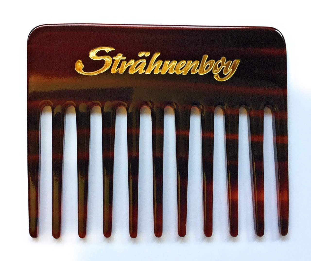 The raw material is of natural origin - the raw material is made of wood. Handmade combs from acetate - we would like to briefly introduce you to the manufacturing process of the elaborately worked combs: First step: stripes are made from the raw product, cellulose acetate panels. Second step: these are shortened to the individual comb lengths.The edges are rounded off in different steps and the tines are sanded. Third step: Now the individual tines are being processed into a smooth cut in a wet process - according to the camera type. Fourth step: The combs receive a final cut and are processed with wood chips for up to 5 days depending on the model for up to 5 days.All edges are continued and the comb gets the first shine. Fifth step: In a final refinement process, each comb receives its material-typical, silky glossy optics and a silver or gold-colored stamp.Each comb runs through a production process of up to 10 days. Selectable design - just enter strands as a search term - strands and strands and strands great - handmade - handmade - Strandsboy - 11 tines - comb length size 3.5 '' approx. 9 cm, height 7 cm Strandsboy Super - 16 tines - comb long length 5 '' approx. 13 cm, height 7 cm Strandsboy black silver - 13 tines - comb length size 4 '' approx. 10 cm, height approx. 6 cm Or in various functional versions as carbon comb .pocket ridge, strand ridge, afrokamm, curl.Carrow length 3.5 '', approx. 9 cm, 11 tines, height approx. 7 cm.Brown, handmade - handmade.Strandsboy with imprint gold colors.Der Rohstoff ist natürlichen Ursprungs – der Rohstoff wird aus Holz gewonnen. Handgemachte Kämme aus Acetat - Wir möchten Ihnen kurz den Herstellungsprozess der aufwendig gearbeiteten Kämme vorstellen: Erster Schritt: Aus dem Rohprodukt, Zellulose-Acetat-Platten, werden Streifen gefertigt. Zweiter Schritt: Diese werden auf die individuellen Kammlängen gekürzt. In verschiedenen Schritten werden die Kanten abgeschrägt und die Zinken angeschliffen. Dritter Schritt : Nun werden die einzelnen Zinken in einem Nässeverfahren - dem Kammtyp entsprechend - zu einem glatten Schliff weiterbearbeitet. Vierter Schritt : Die Kämme erhalten einen Endschliff und werden modellabhängig bis zu 5 Tage lang in einem "Tümmler" mit Holzspänen bearbeitet. Alle Kanten werden weiter geschliffen und der Kamm erhält ersten Glanz. Fünfter Schritt : In einem abschließenden Verfeinerungsverfahren erhält jeder Kamm seine materialtypische, seidig-glänzende Optik und einen silber- oder goldfarbenen Stempel. Jeder Kamm durchläuft einen Fertigungsprozess von bis zu 10 Tagen. Ausführung wählbar - als Suchbegriff einfach Strähnenboy eingeben - Strähnenboy und Strähnenboy Super - handgemacht - handmade – Strähnenboy - 11 Zinken - Kamm-Längenmaß 3,5'' ca. 9 cm, Höhe 7 cm Strähnenboy Super - 16 Zinken - Kamm-Längenmaß 5 '' ca. 13 cm, Höhe 7 cm Strähnenboy schwarz silber - 13 Zinken - Kamm-Längenmaß 4'' ca. 10 cm, Höhe ca. 6 cm oder in verschiedenen Funktionsausführungen als Carbonkamm …Taschenkamm, Strähnenkamm, Afrokamm, Lockenkamm. Kamm-Längenmaß 3,5'', ca. 9 cm, 11 Zinken, Höhe ca. 7 cm. braun, handgemacht - handmade. Strähnenboy mit Aufdruck goldfarben.