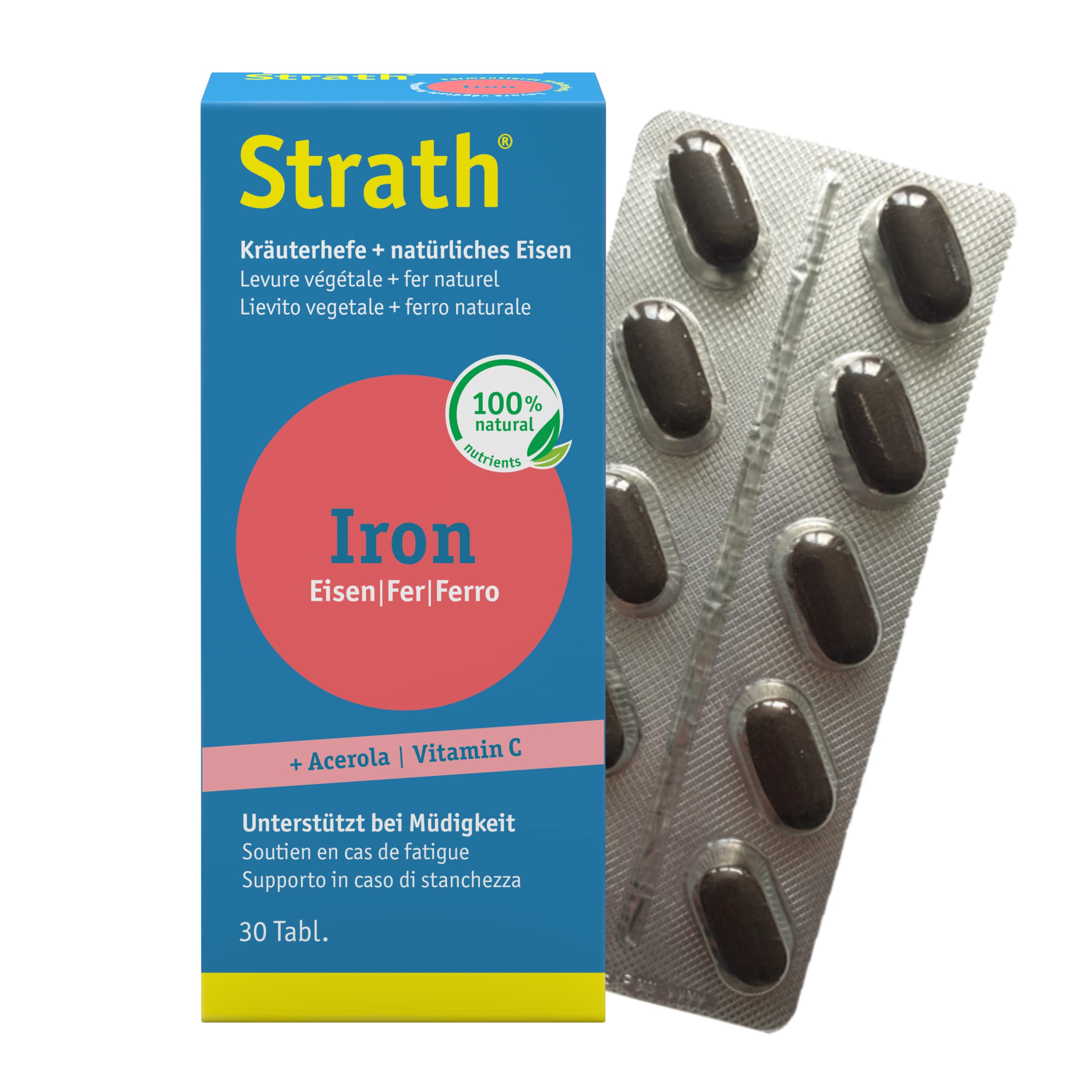Strath Iron is made from natural iron, fermented plant yeast containing 61 micronutrients, and vitamin C. Its fermented form ensures iron is well absorbed by the body. Natural vitamin C and plant yeast also aid absorption. INGREDIENTS Plasmolyzed plant yeast 26 (S. cerevisiae, plant extract), bulking agent (microcrystalline cellulose), fermented koji with iron 17 (inactive koji, iron sulfate), bulking agent (calcium phosphates), corn starch, acerola powder 5 , glazing agent (hydroxypropyl methylcellulose), color (caramel), stabilizer (fatty acids), glazing agent (fatty acids), rice starch, color (vegetable charcoal). DIRECTIONS 1 tablet per day. SAFETY WARNING Do not exceed the stated recommended daily dose. The food supplement should be kept out of reach of children. The food supplement should not be used as a substitute for a varied healthy diet. 1 tab. NRV Iron 14 mg 100 Vitamin C 12 mg 15 NRV: Nutrient Reference Value. STRATH IRON - BASED ON PLANT YEAST AND NATURAL FERMENTED IRON TO REDUCE FATIGUE AND EXHAUSTION AND PROMOTES ENERGY-YIELDING METABOLISM. Strath Iron est à base de fer naturel, de levure végétale fermentée qui renferme 61 micronutriments et de vitamine C. Grâce à sa forme fermentée, le fer est bien absorbé par l'organisme. La vitamine C naturelle et la levure végétale favorisent également l'absorption. INGRÉDIENTS Levure végétale plasmolysée 26 (S. cerevisiae, extrait végétal), agent de charge (cellulose microcristalline), koji fermenté avec du fer 17 (koji inactif, sulfate de fer), agent de charge (phosphates de calcium), amidon de maïs, poudre d'acérola 5 , agent d'enrobage (hydroxypropylméthylcellulose), colorant (caramel), stabilisateur (acides gras), agent d'enrobage (acides gras), amidon de riz, colorant (charbon végétal). MODE D'EMPLOI 1 comprime par jour. AVERTISSEMENT DE SÛRETÉ Ne pas dépasser la dose quotidienne recommandée indiquée. Le complement alimentaire doit être conservé hors de la portée des enfants. Le complément alimentaire ne doit pas se substituer à une alimentation variée saine. 1 compr. VNR Fer 14 mg 100 Vitamin C 12 mg 15 VNR: Valeurs nutritionnelles de référence. STRATH IRON - à BASE DE LEVURE VÉGÉTALE ET DU FER NATUREL FERMENTÉ POUR RÉDUIRE L'ÉTAT DE FATIGUE ET D'ÉPUISEMENT ET FAVORISE UN MÉTABOLISME ÉNERGÉTIQUE.