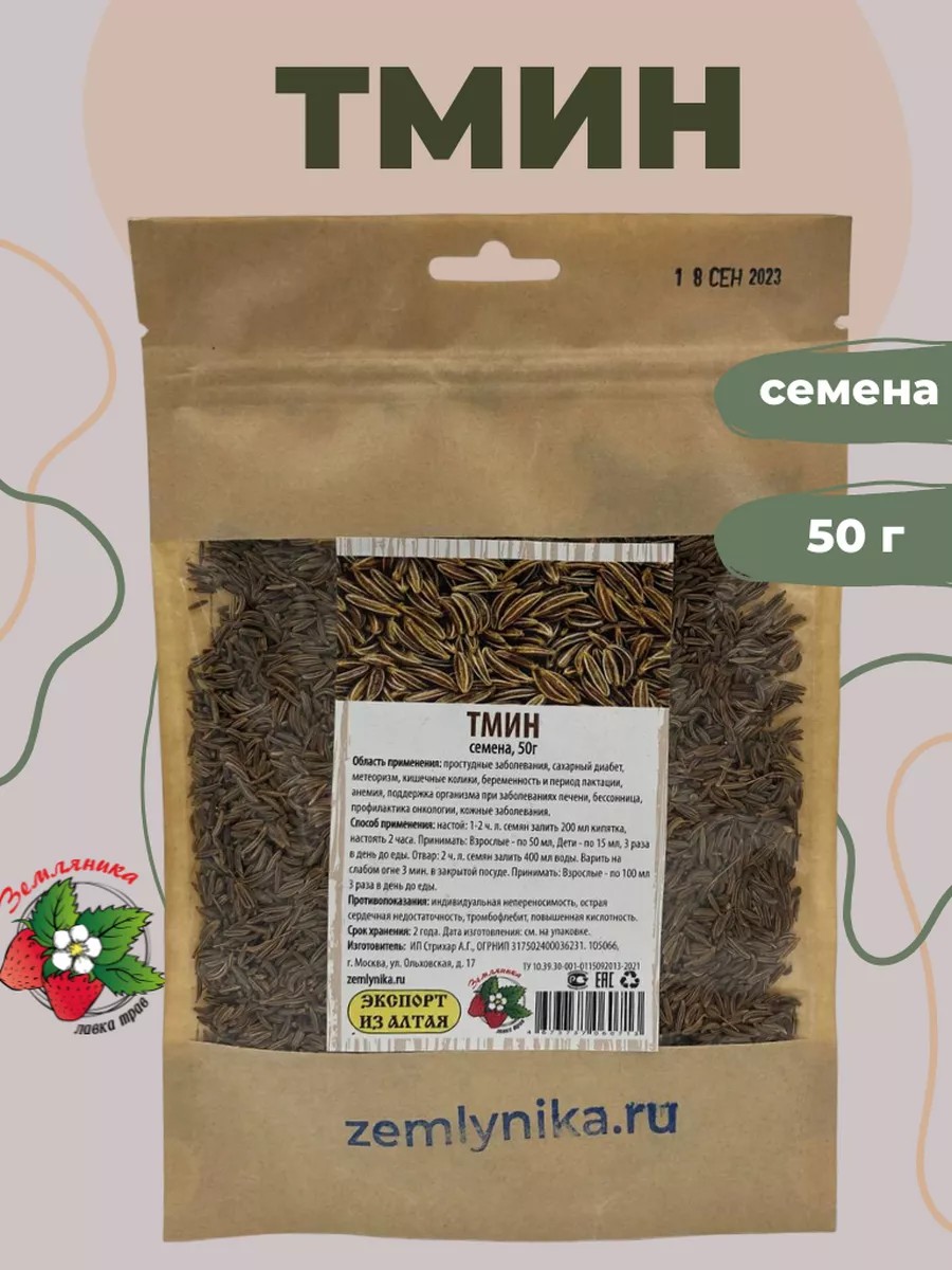 Тмин семена 50г, область применения: простудные заболевания, сахарный диабет, метеоризм, кишечные колики, беременность и период лактации, анемия, поддержка организма при заболеваниях печени, бессонница, профилактика онкологии, кожные заболевания. Способ применения: настой: 1-2 ч. л. семян залить 200 мл кипятка, настоять 2 часа. Принимать: Взрослые - по 50 мл, Дети - по 15 мл, 3 раза в день до еды. Отвар: 2 ч. л. семян залить 400 мл воды. Варить на слабом огне 3 мин. в закрытой посуде. Принимать: Взрослые - по 100 мл 3 раза в день до еды. Противопоказания: индивидуальная непереносимость, острая сердечная недостаточность, тромбофлебит, повышенная кислотность.